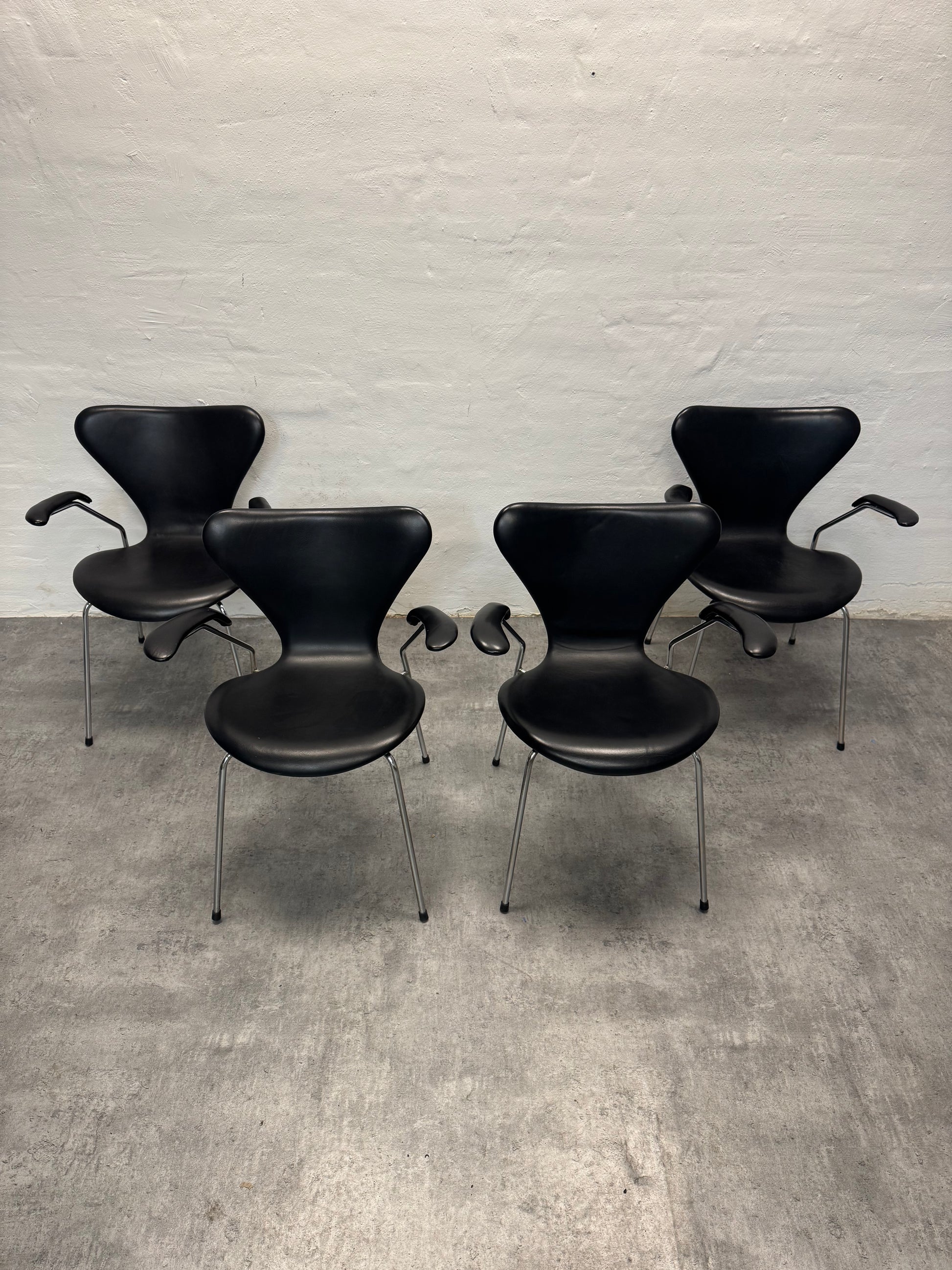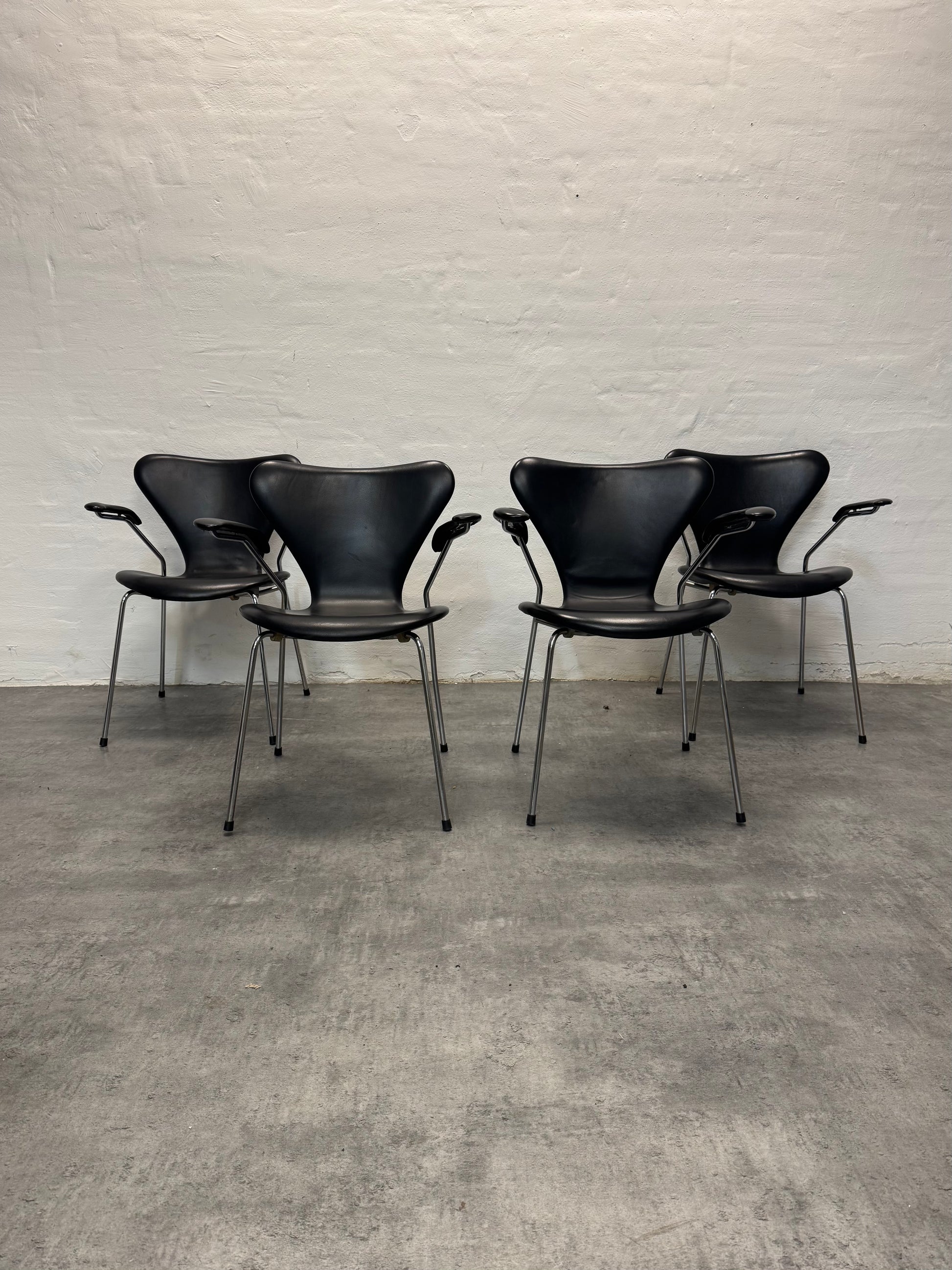Flotte og klassiske syverstole med armlæn i sort læder.