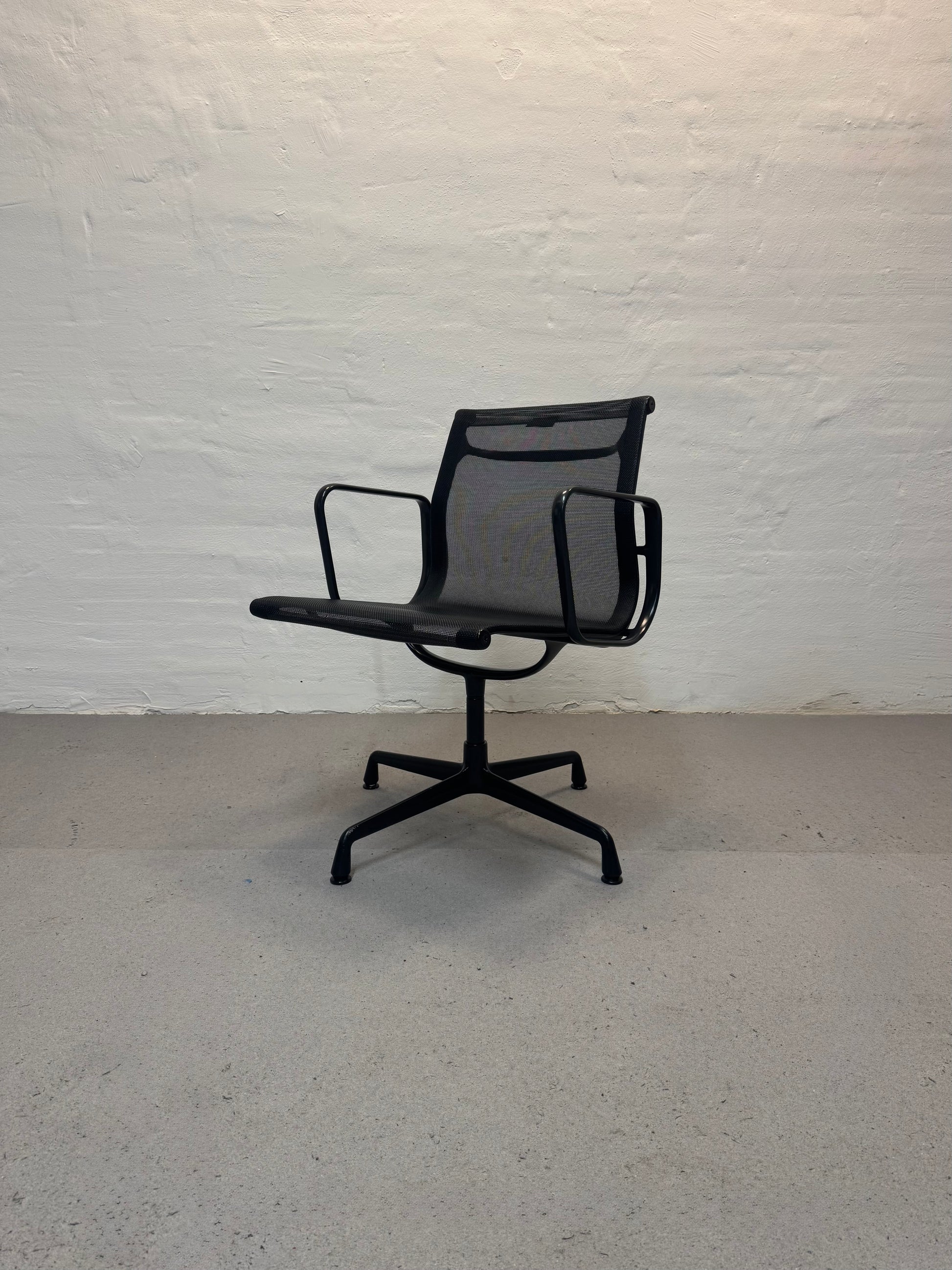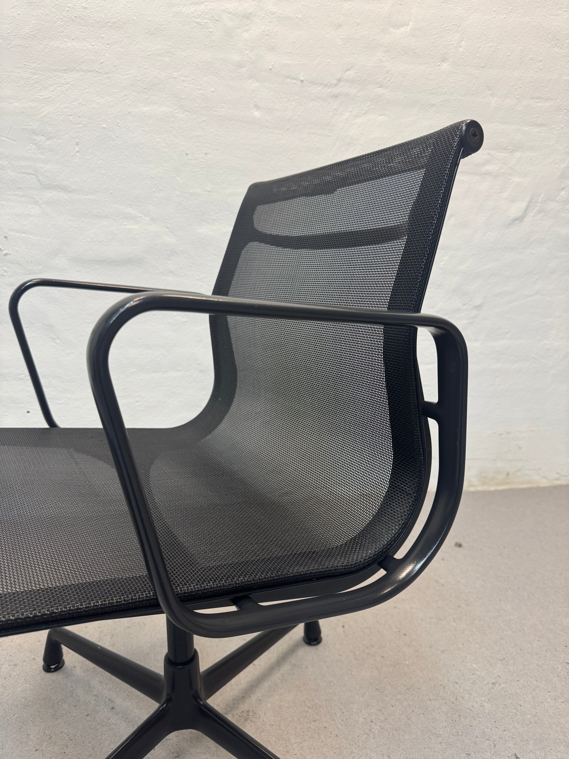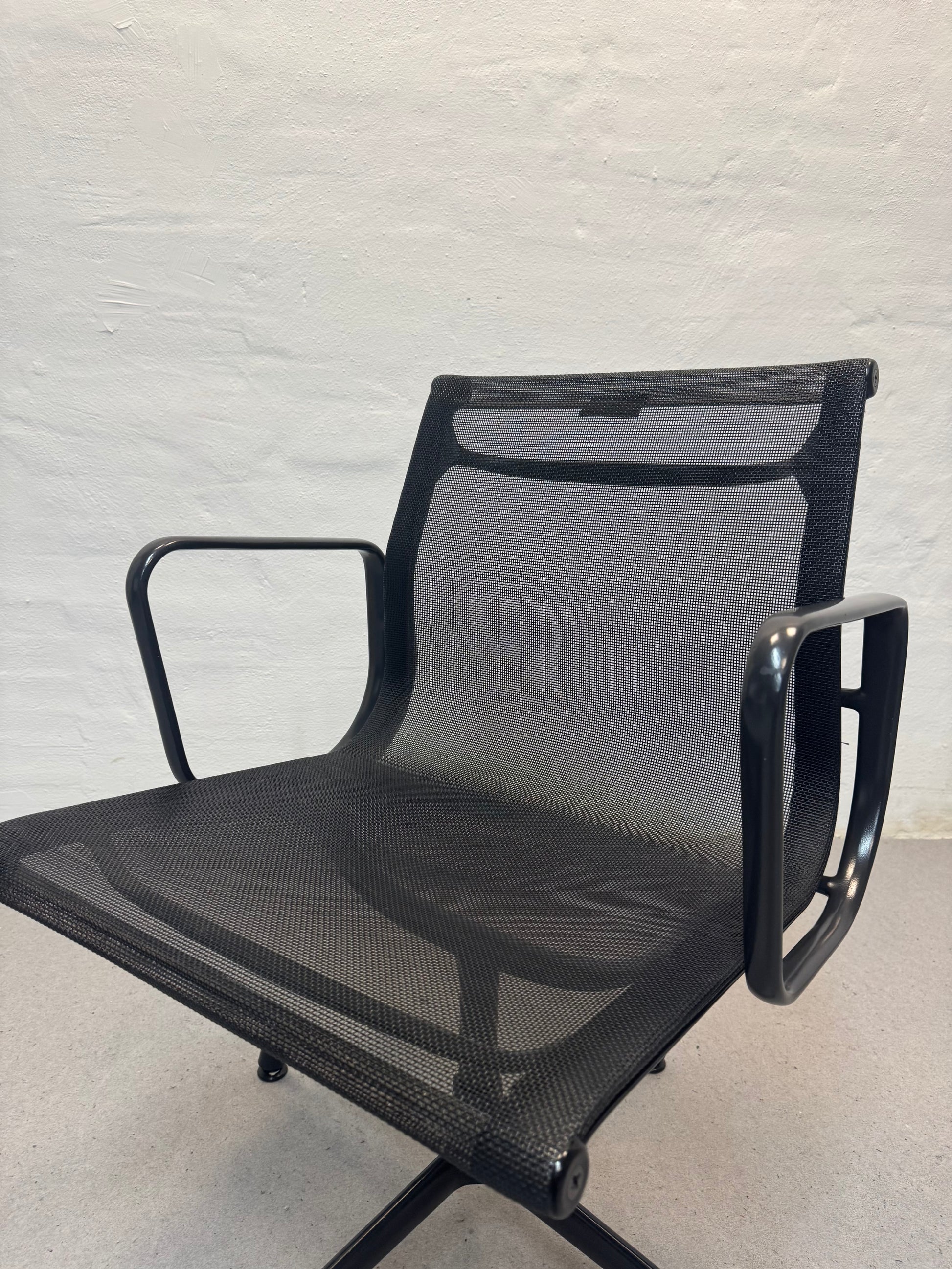 Flot Charles Eames EA 107 kontorstole i sort mesh og sort stel af aluminium.