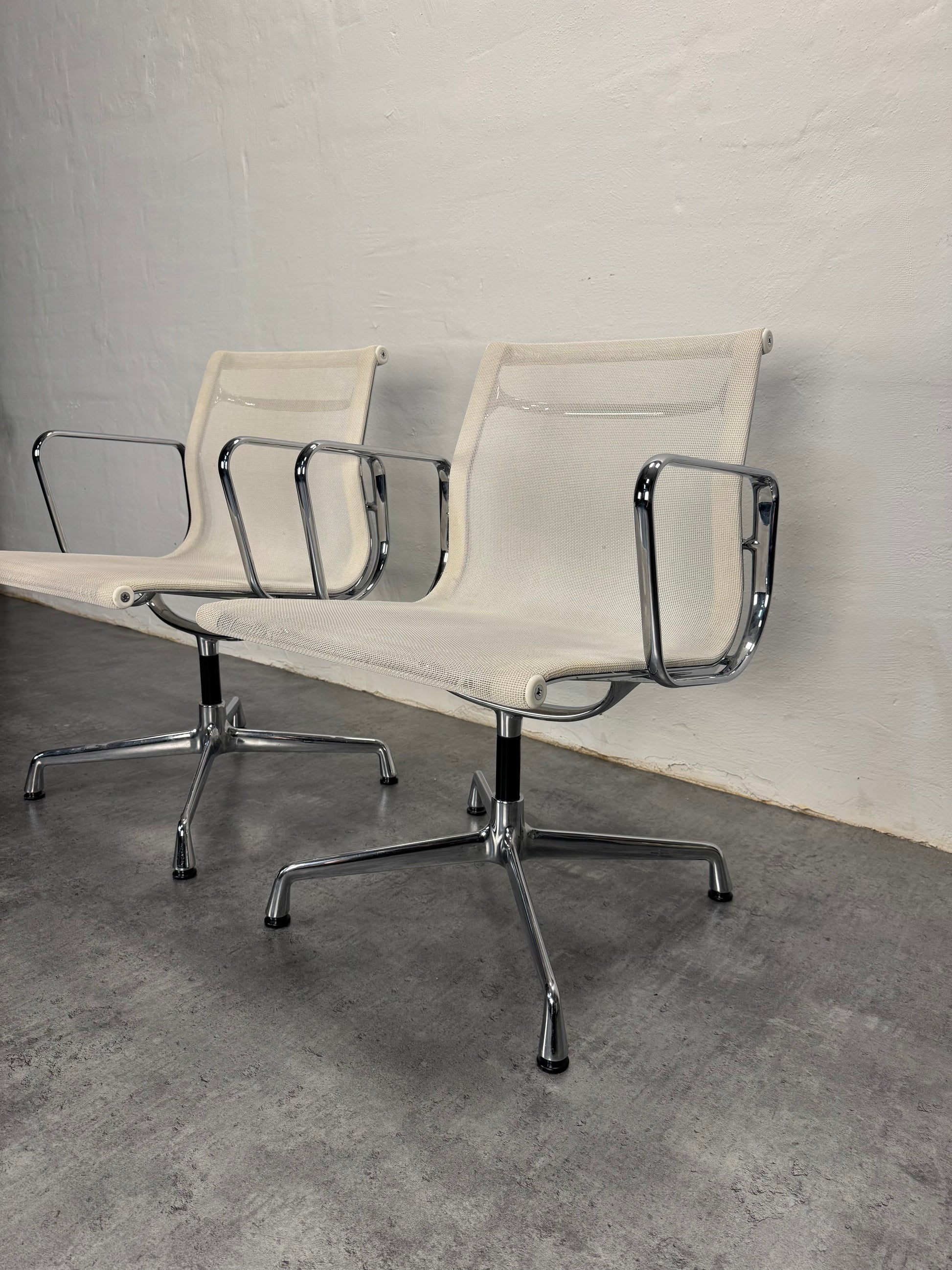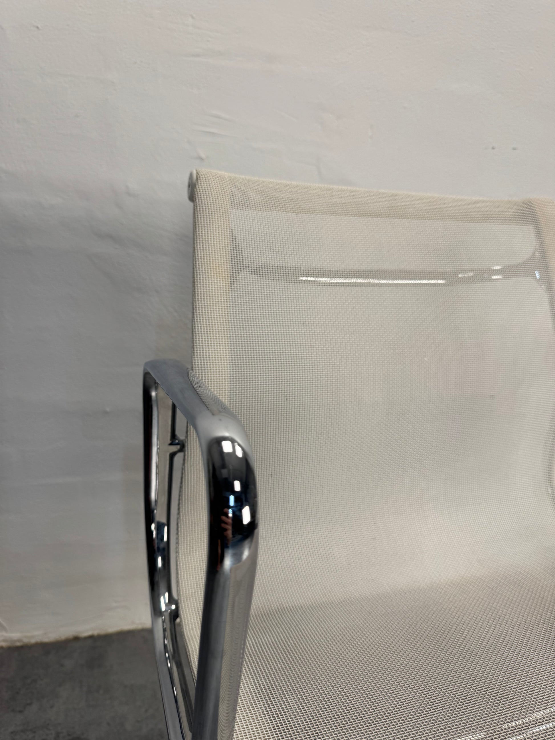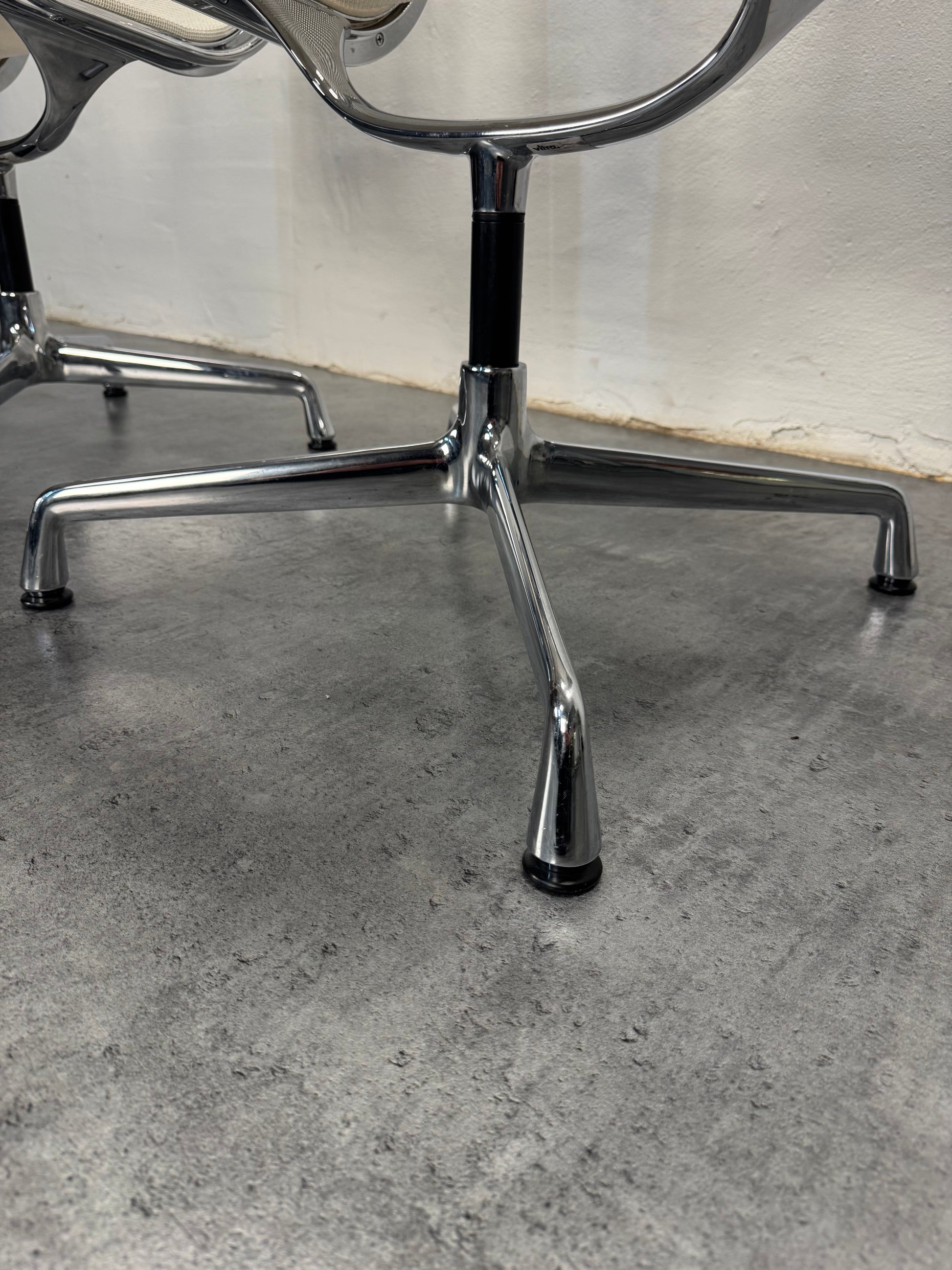 Flotte Charles Eames EA 107 kontorstole i hvidt mesh og stel af aluminium.