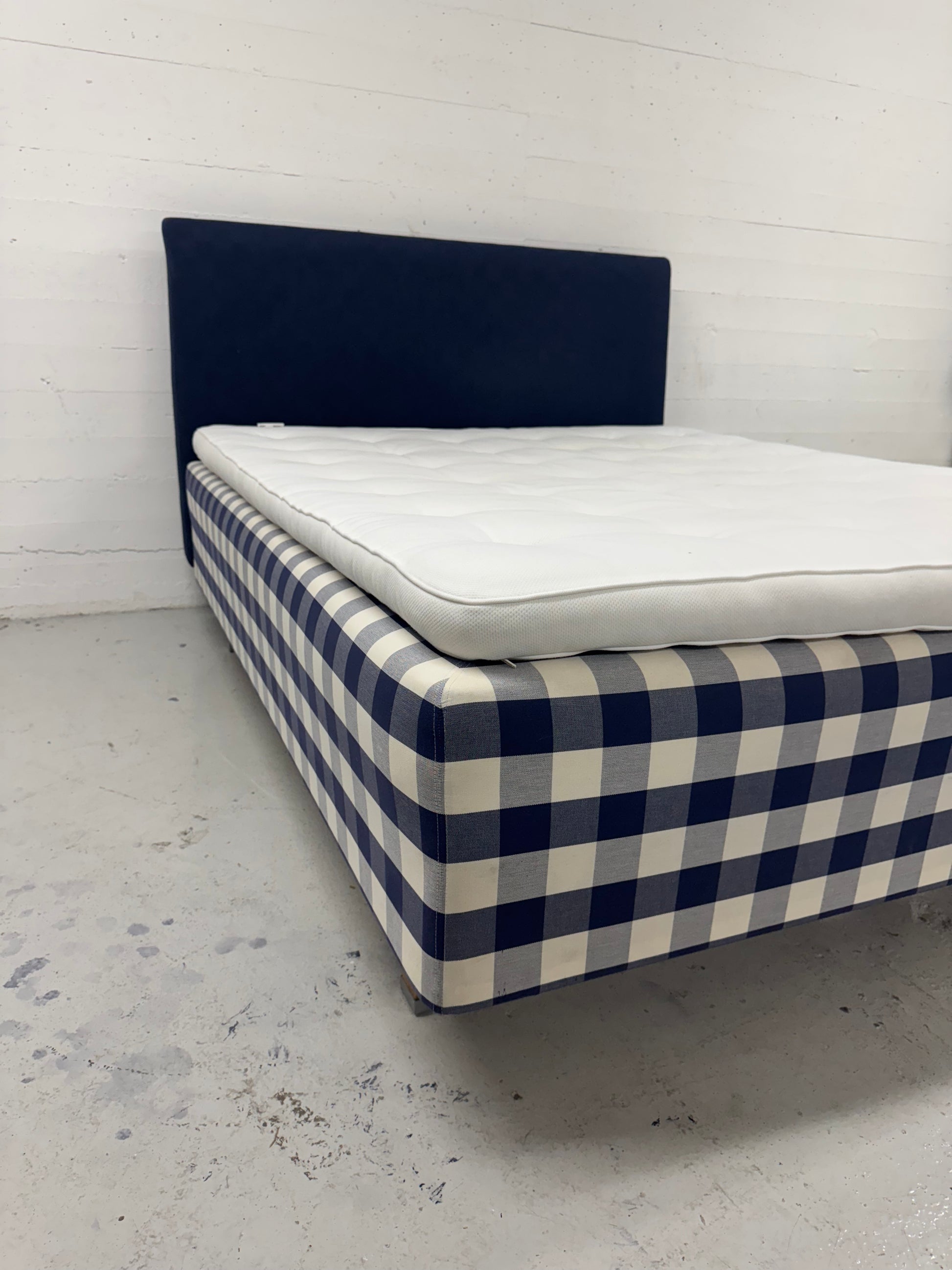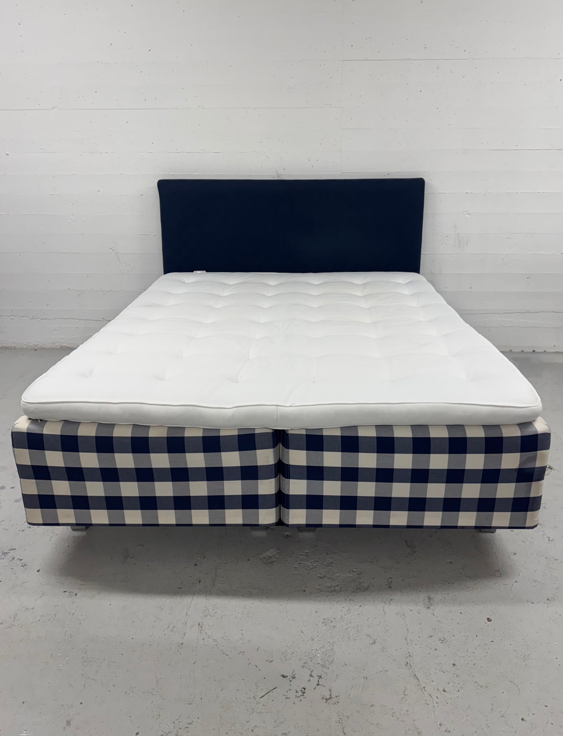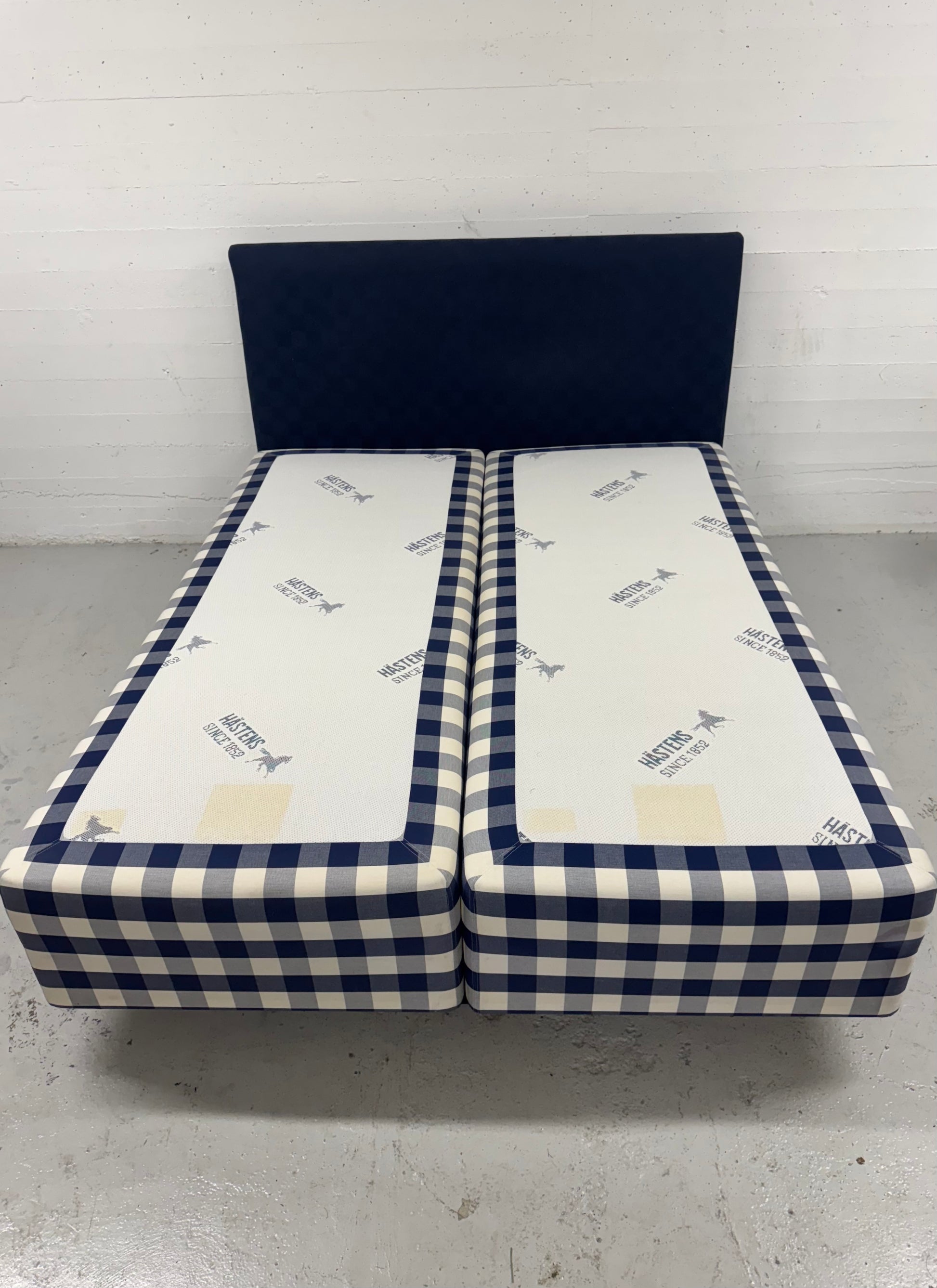 Eksklusiv Hästens dobbeltseng i topkvalitet, blå/hvid ternet stof og med Hästens sengegavl.