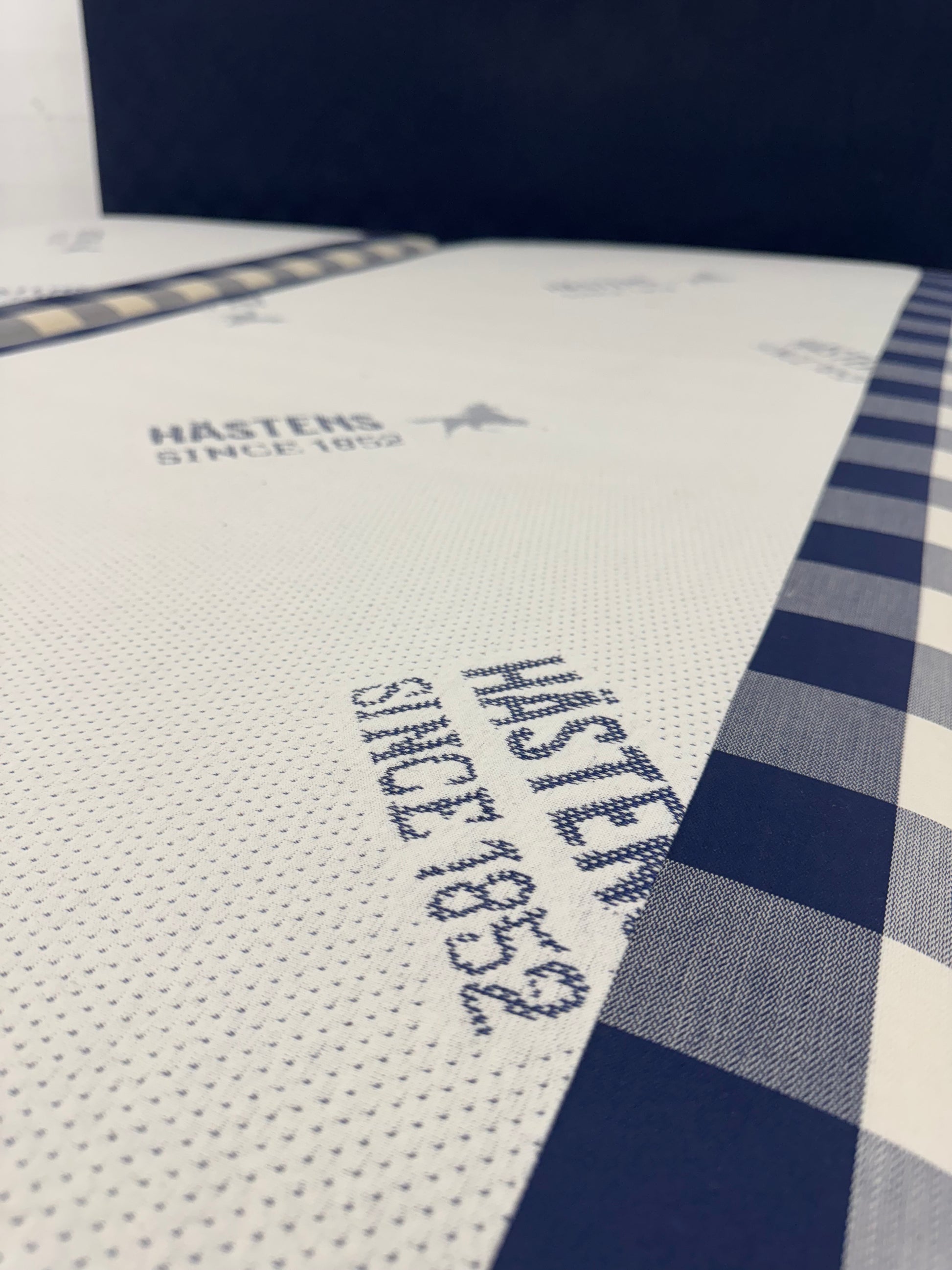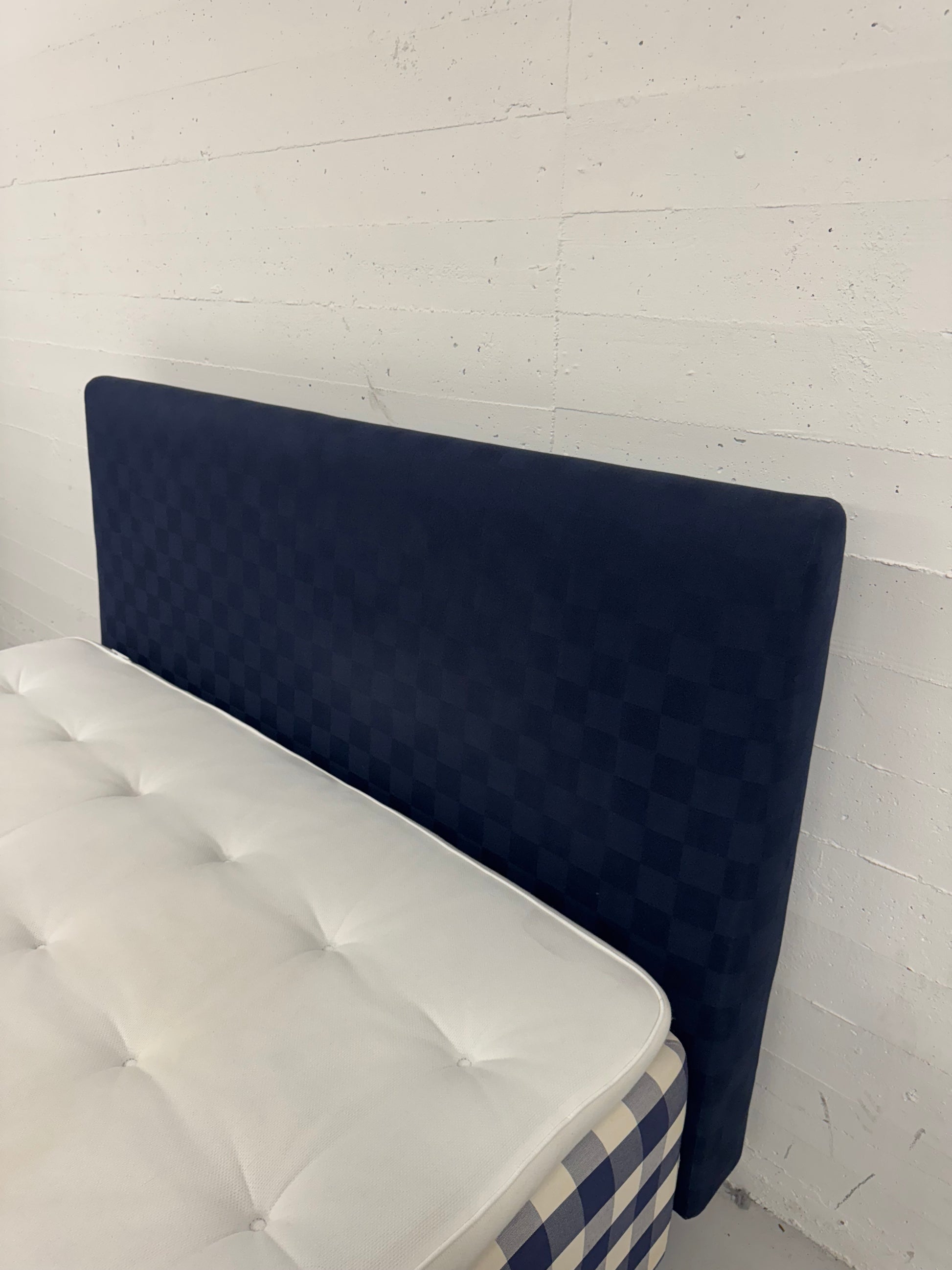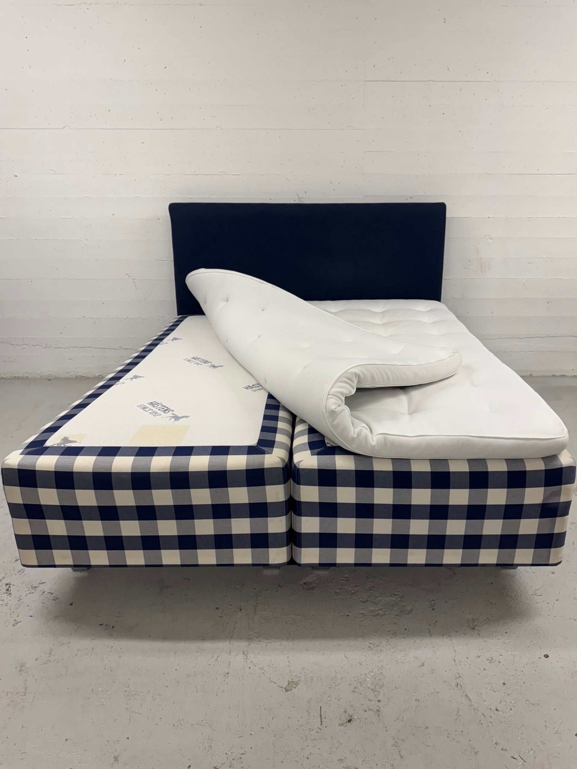 Eksklusiv Hästens dobbeltseng i topkvalitet, blå/hvid ternet stof og med Hästens sengegavl.