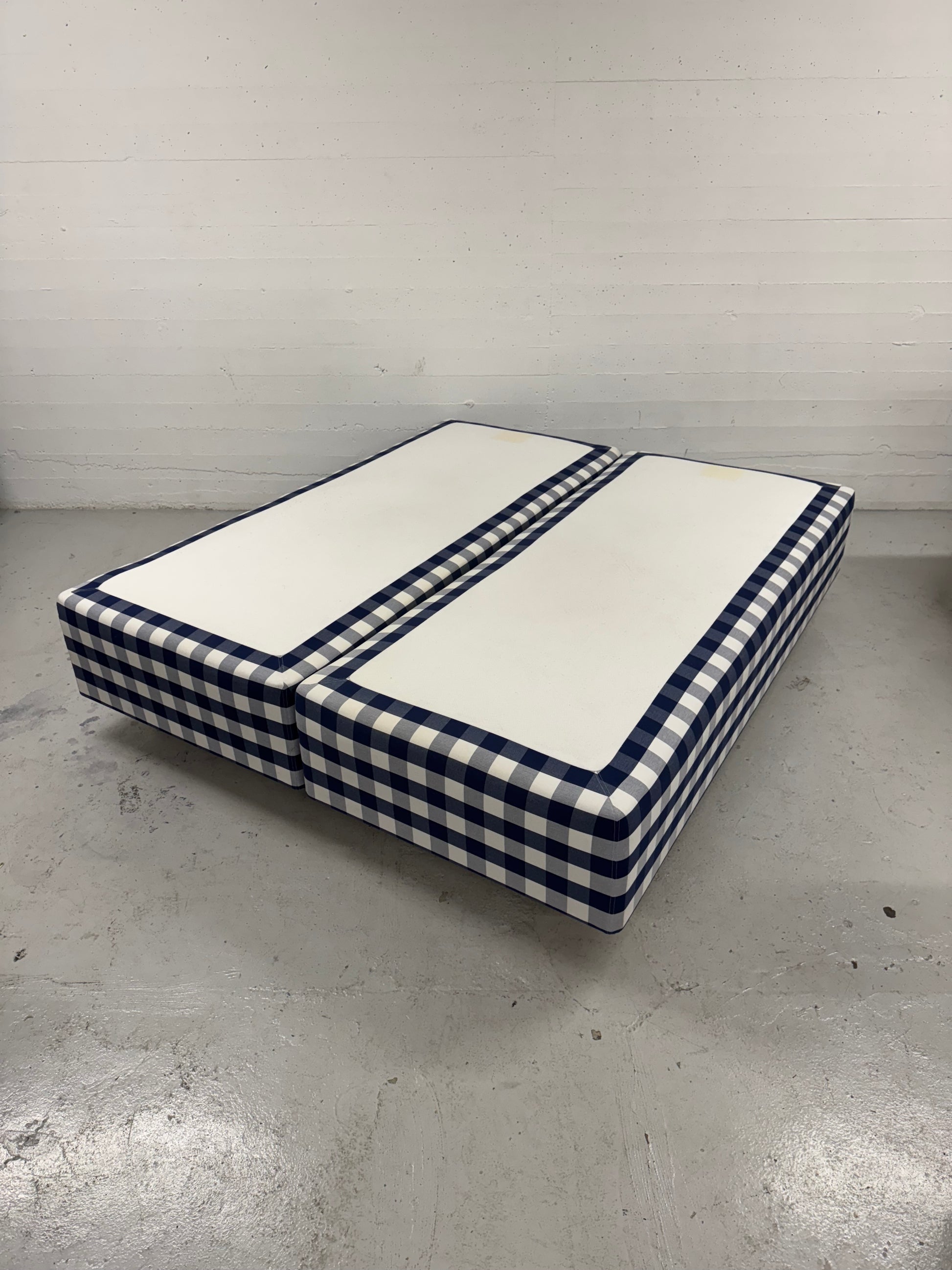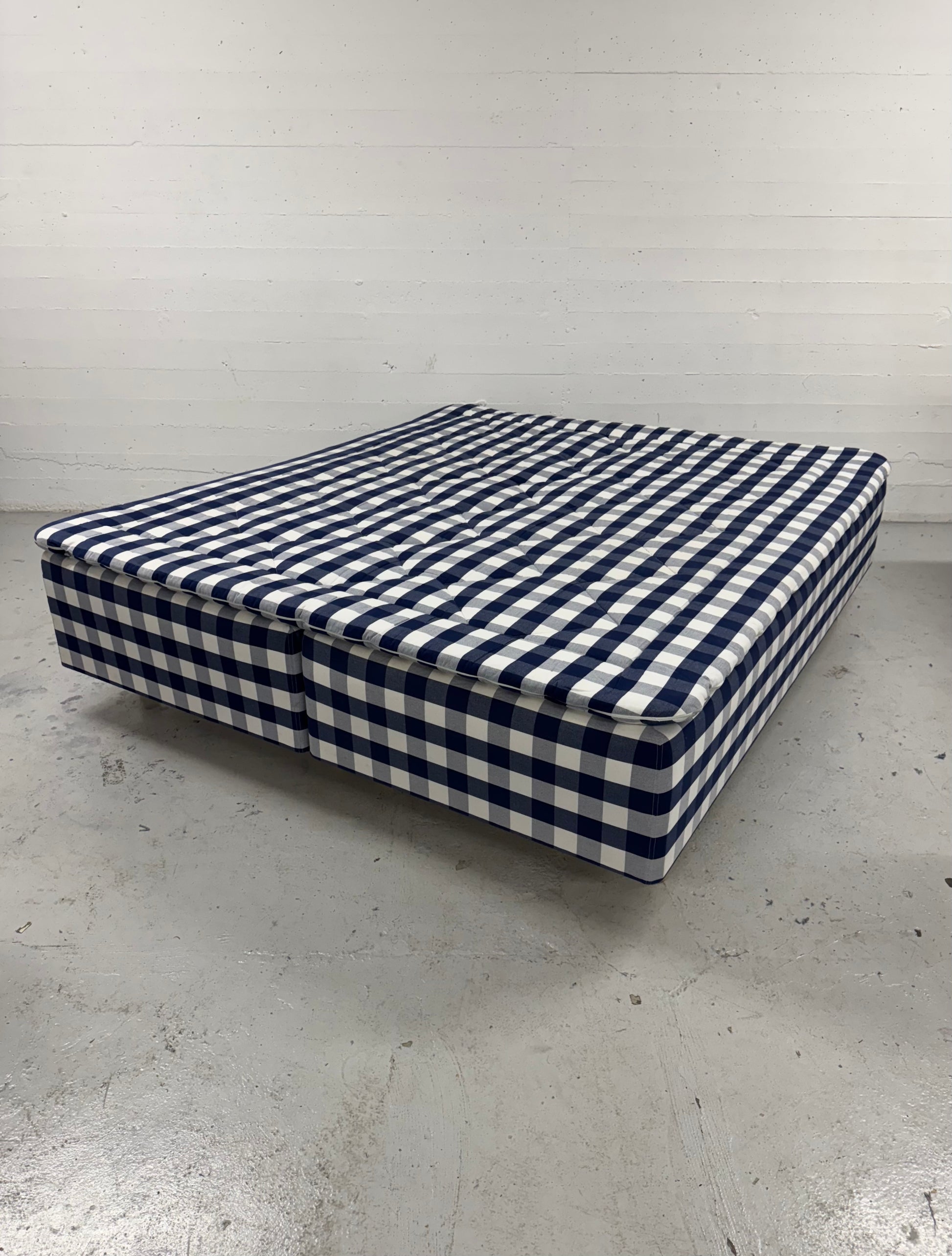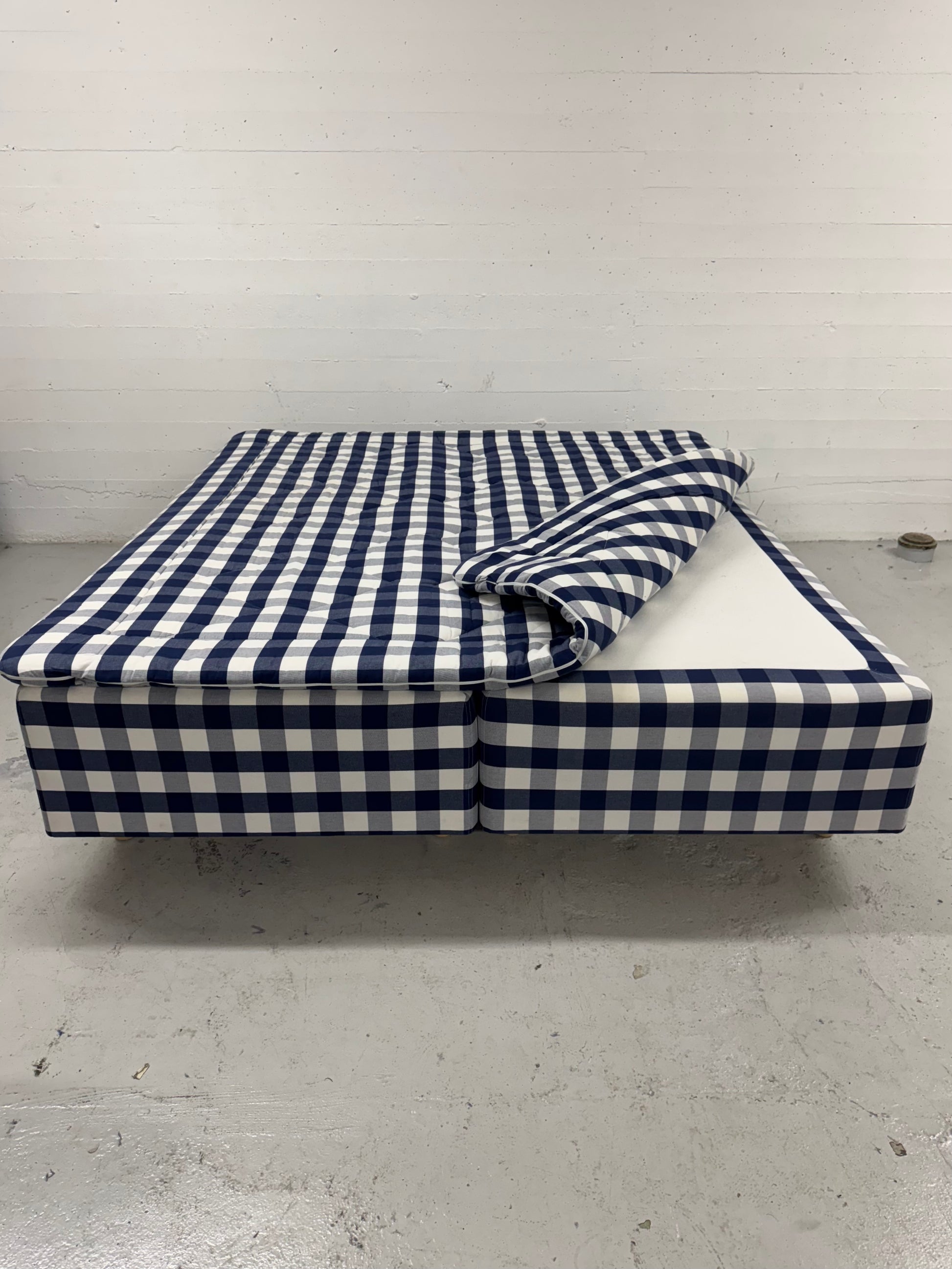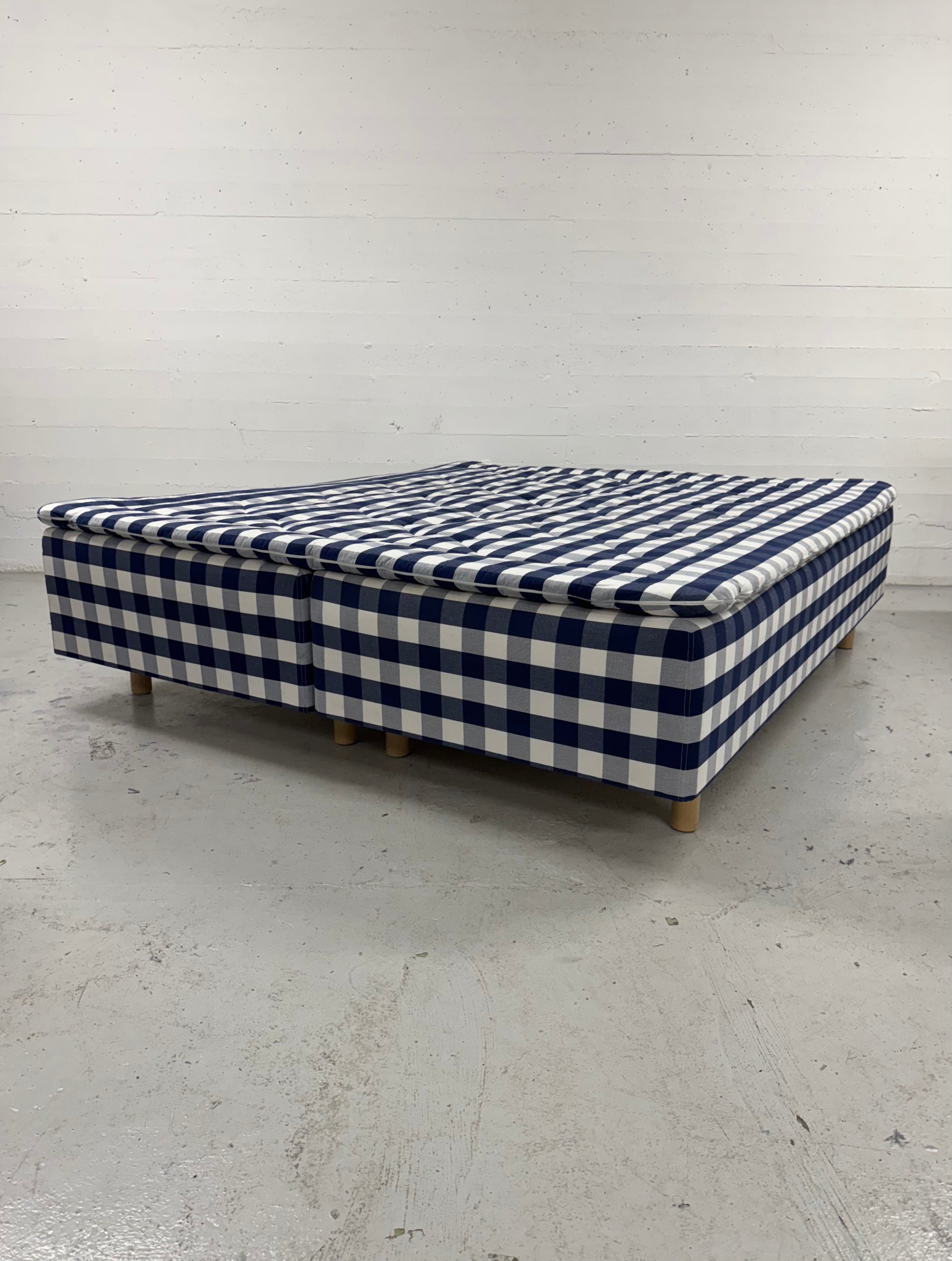 Eksklusiv Hästens dobbeltseng i topkvalitet, blå/hvid ternet stof.