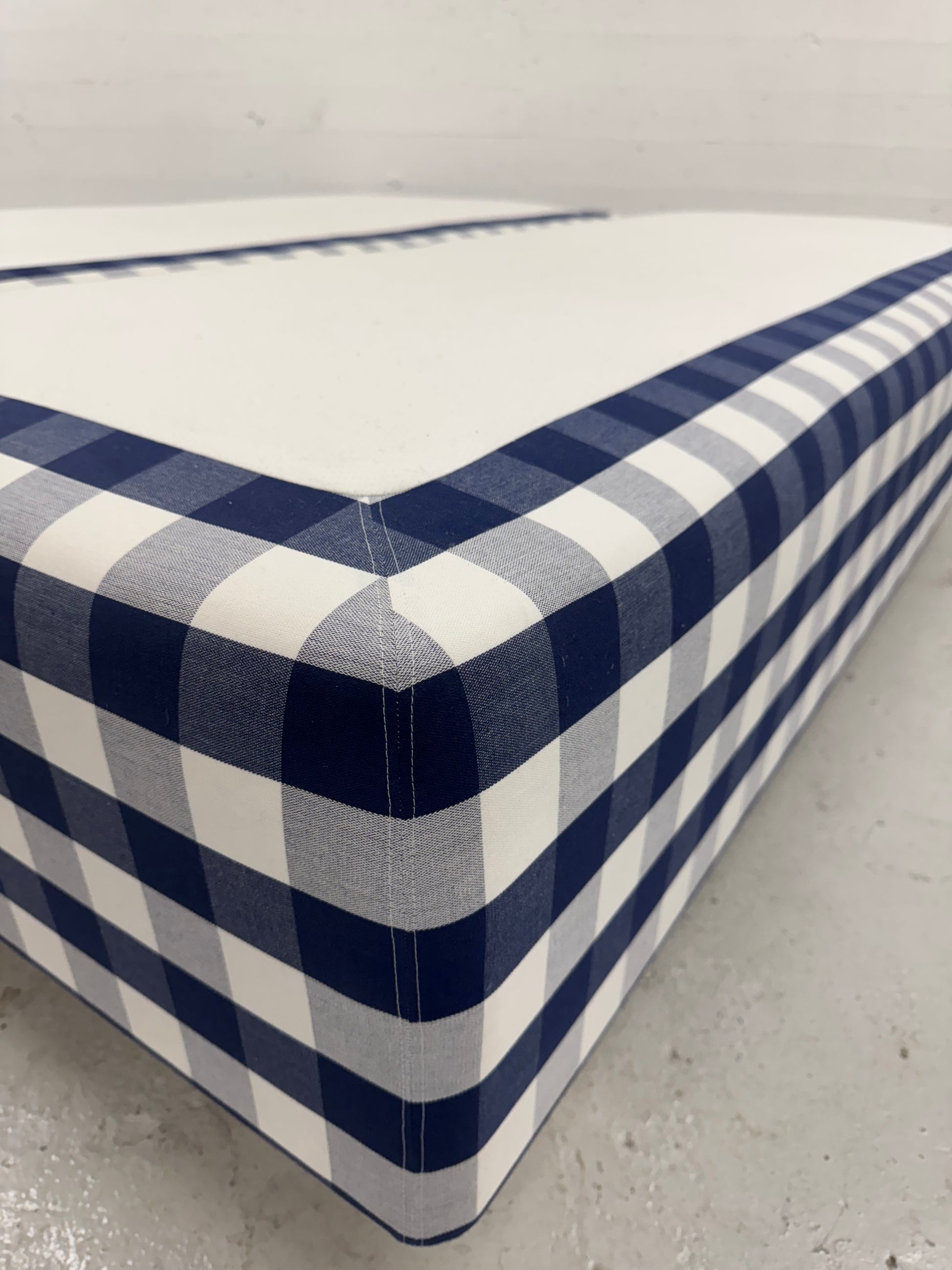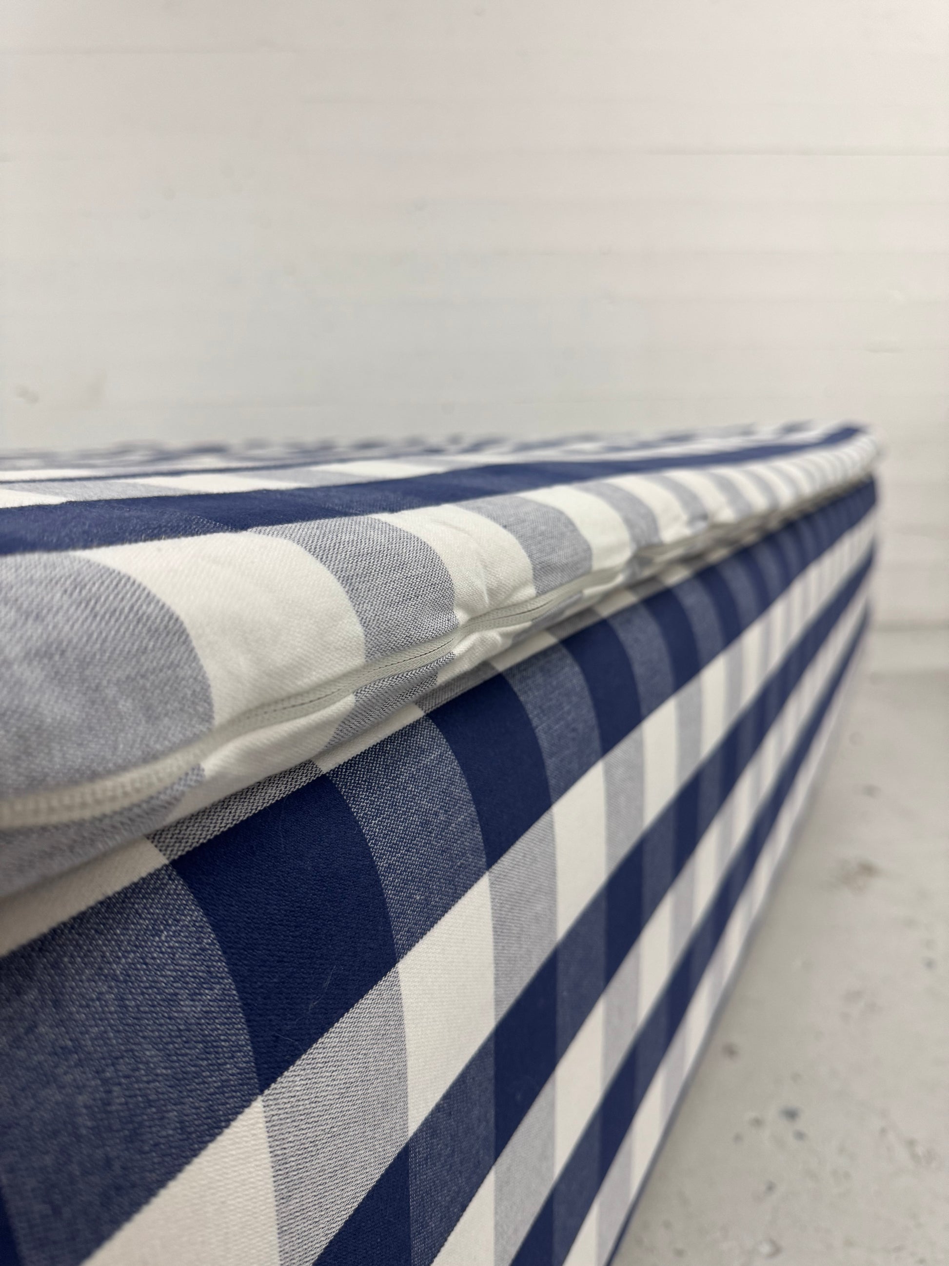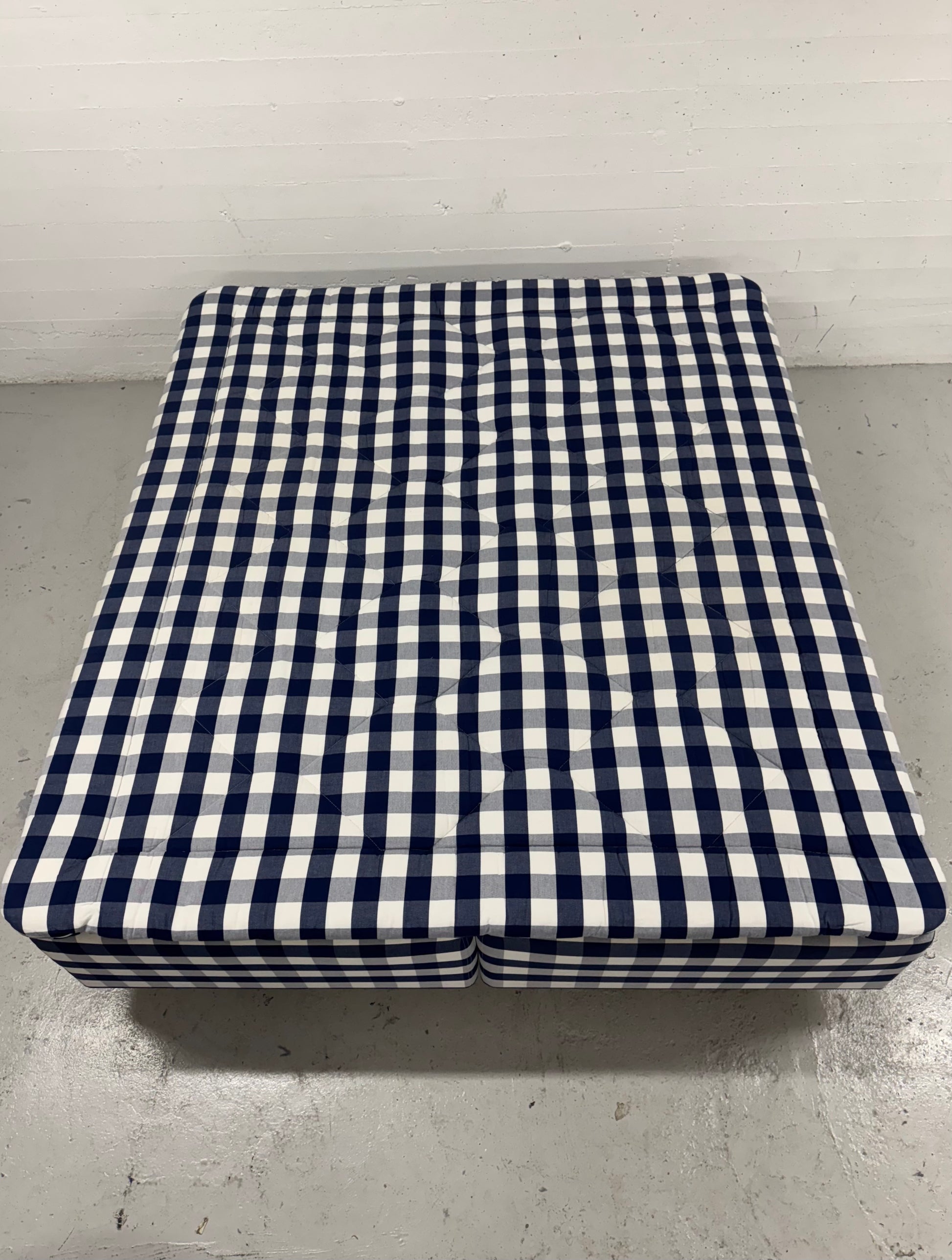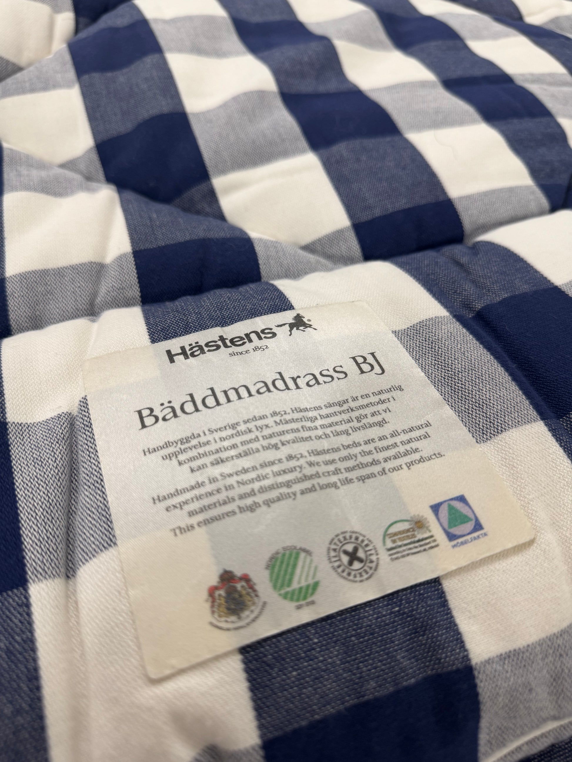 Eksklusiv Hästens dobbeltseng i topkvalitet, blå/hvid ternet stof.