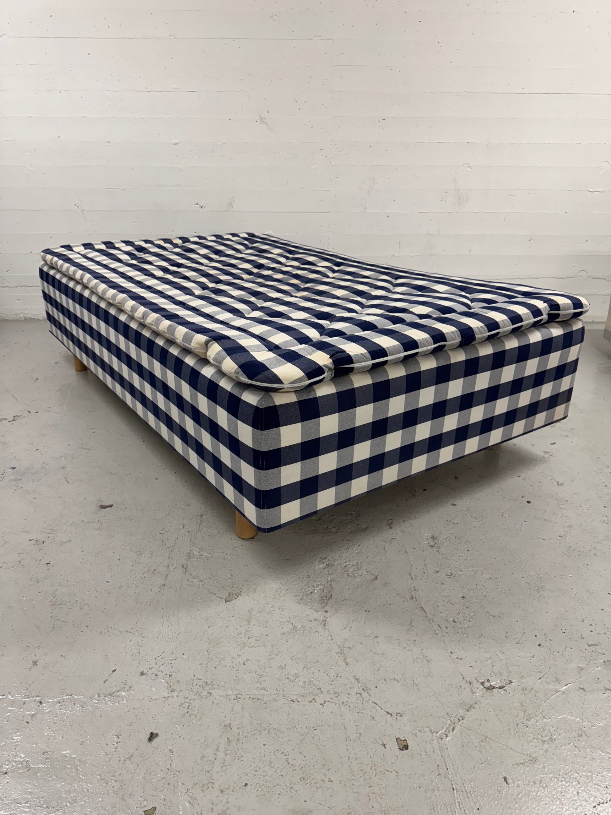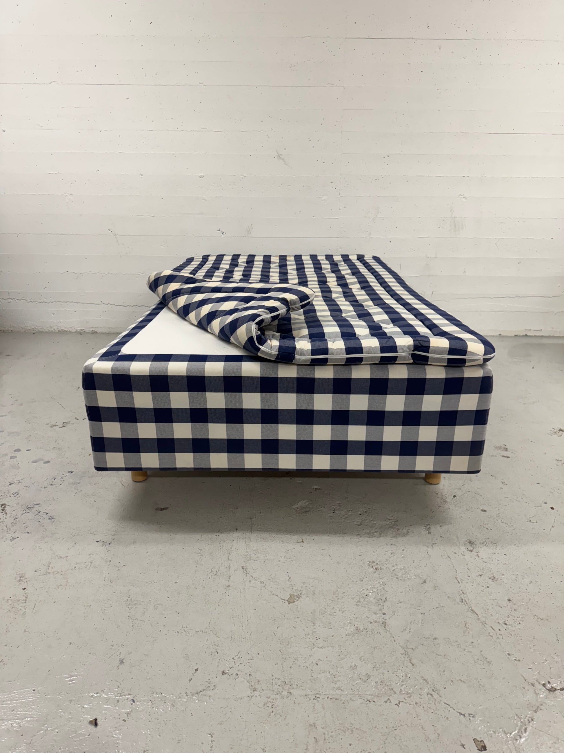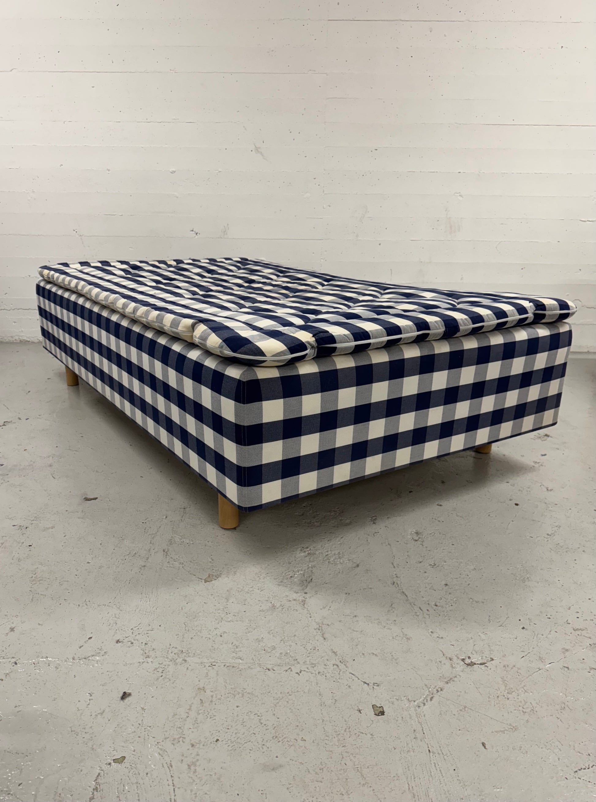 Eksklusiv Hästens ‘superia’ halvanden mands seng/enkeltseng i topkvalitet, blå/hvid ternet stof.
