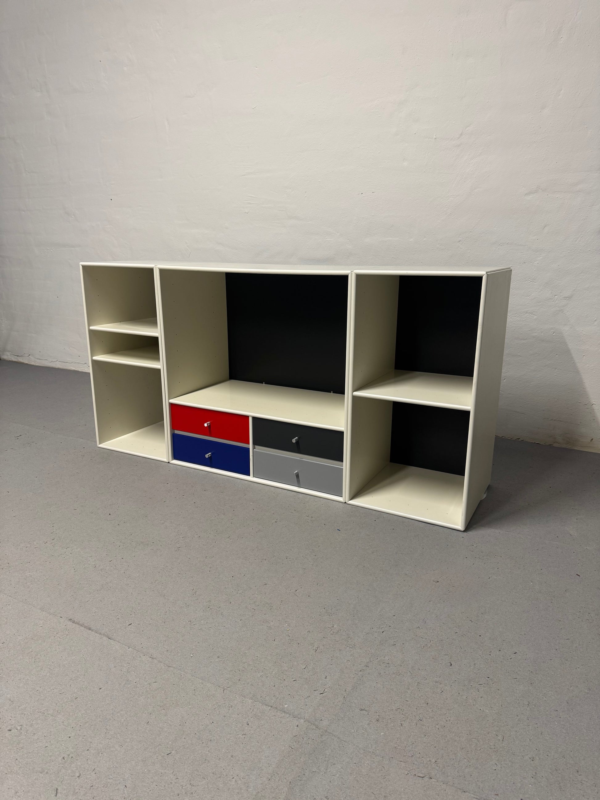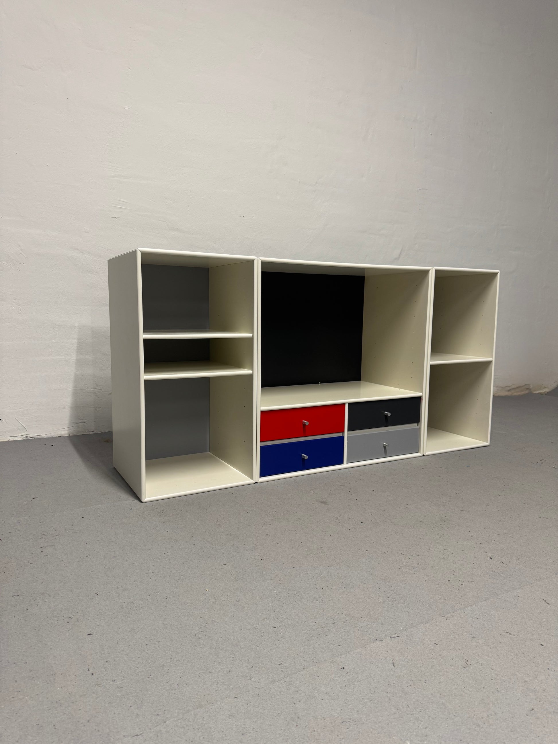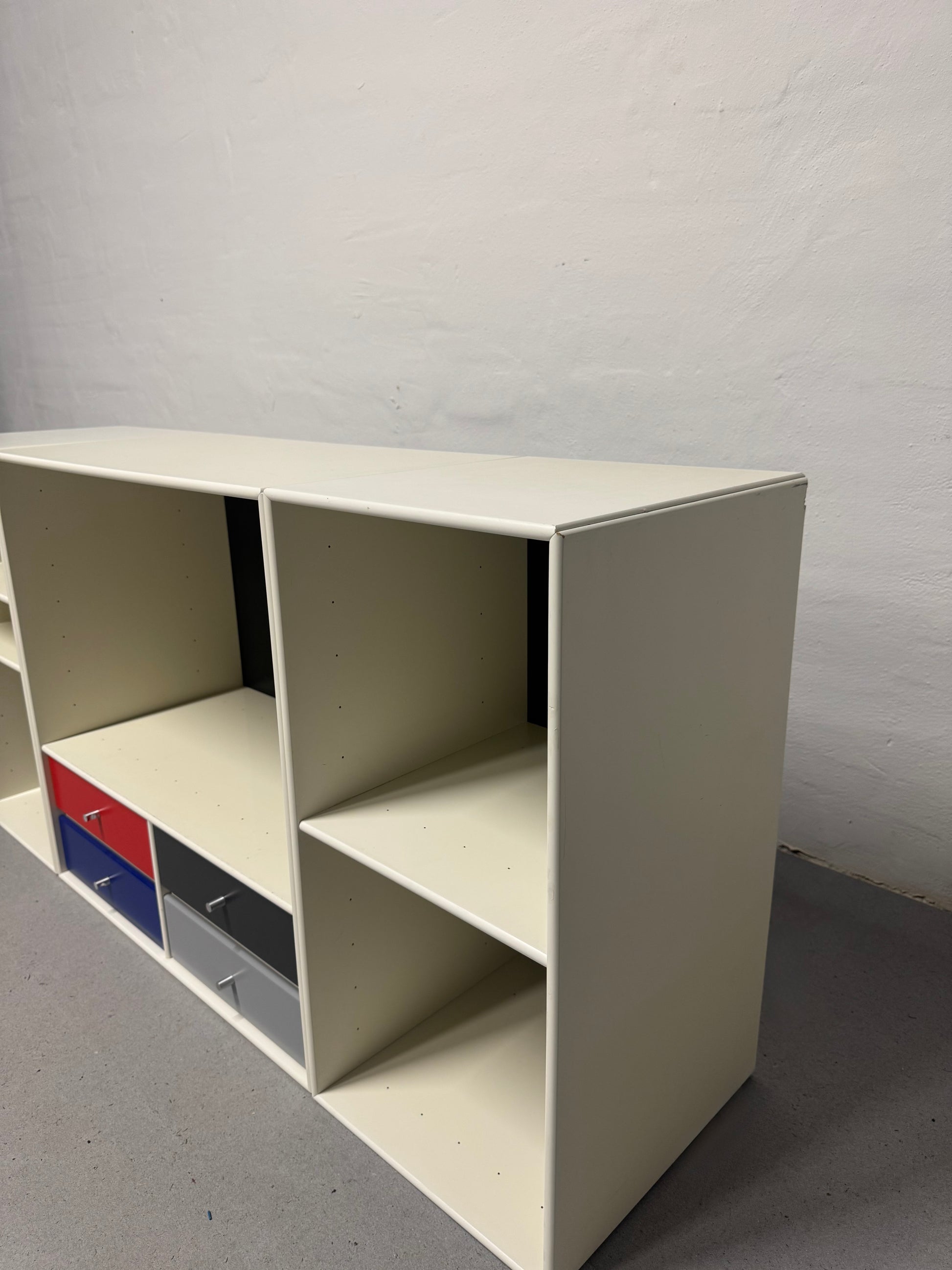 Hvide Montana moduler, super flot og elegant udtryk -med hylder som kan rykkes rundt alt efter behov og skuffer i flotte farver. Ophæng medfølger.