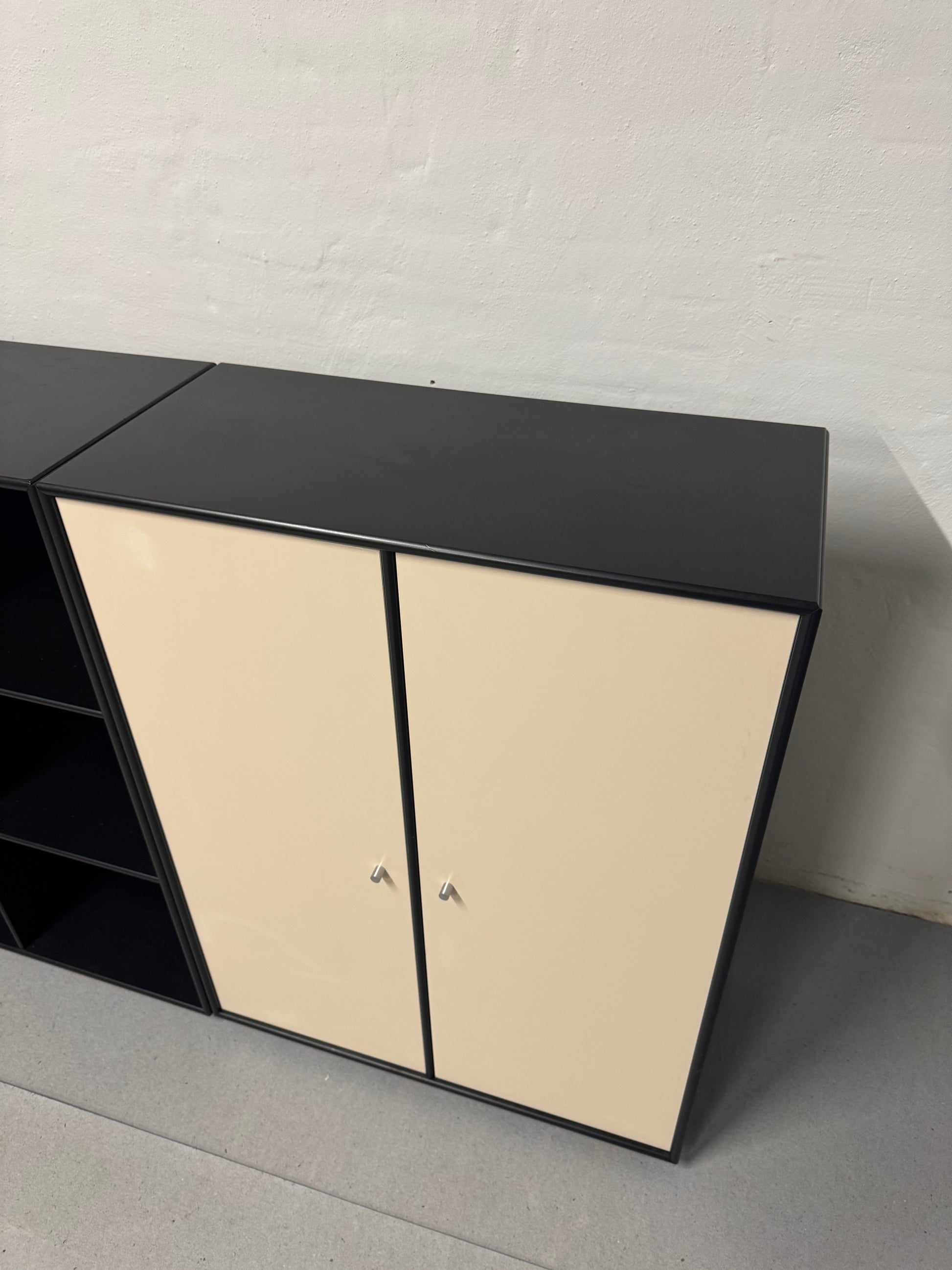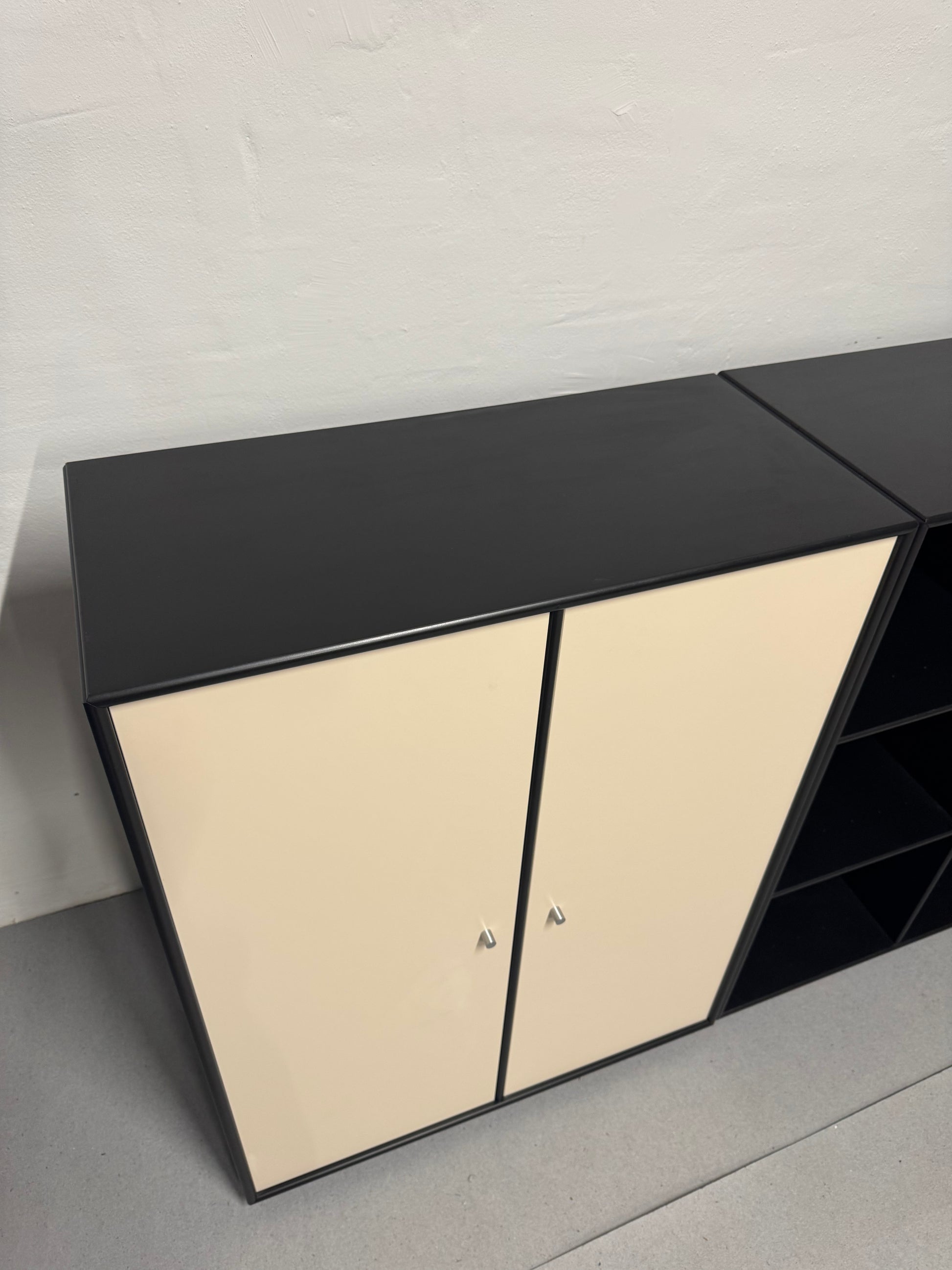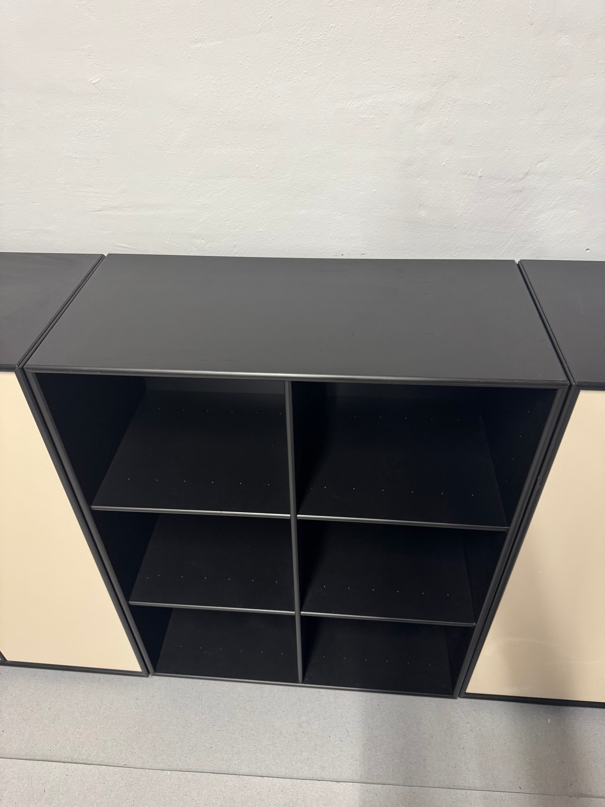 Sorte Montana moduler, super flot og elegant udtryk, med hylder som kan rykkes rundt alt efter behov, samt låger på to af modulerne -der er seks rum i hvert modulet.