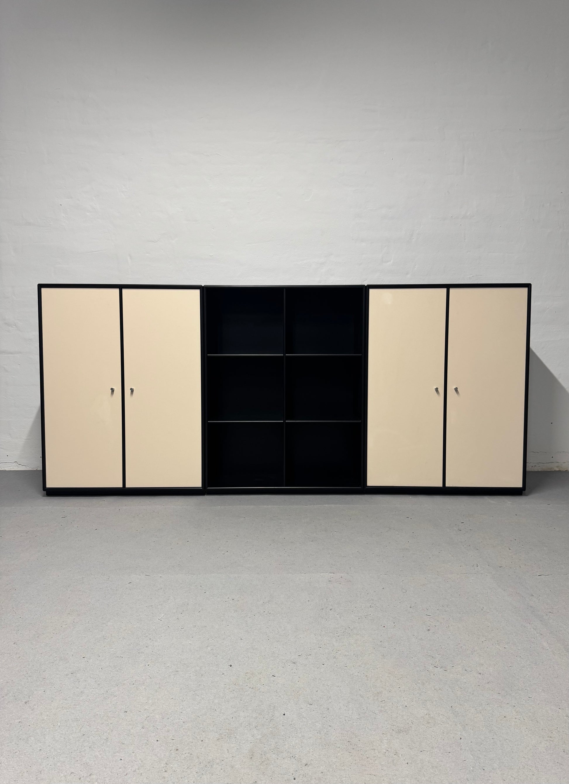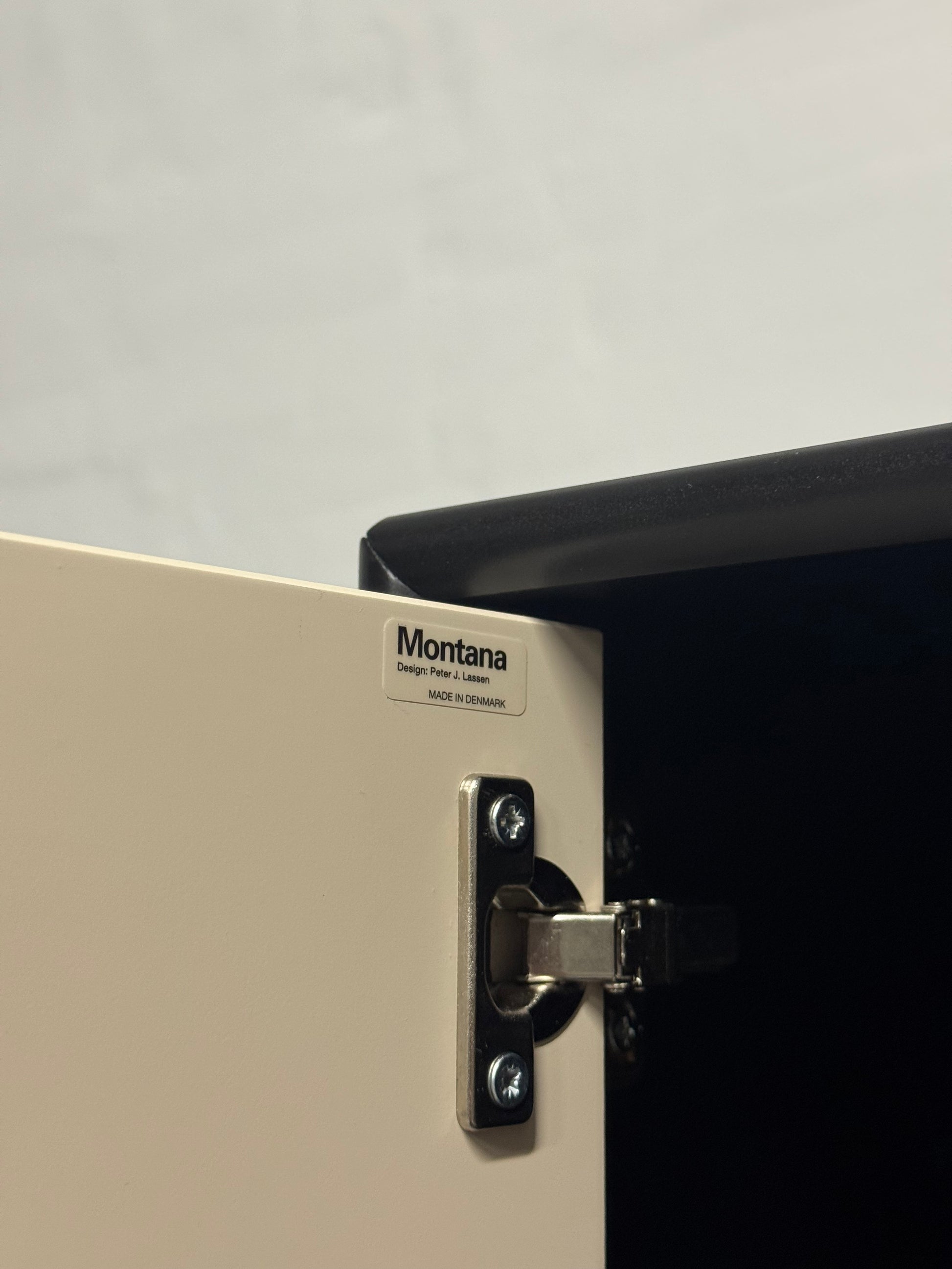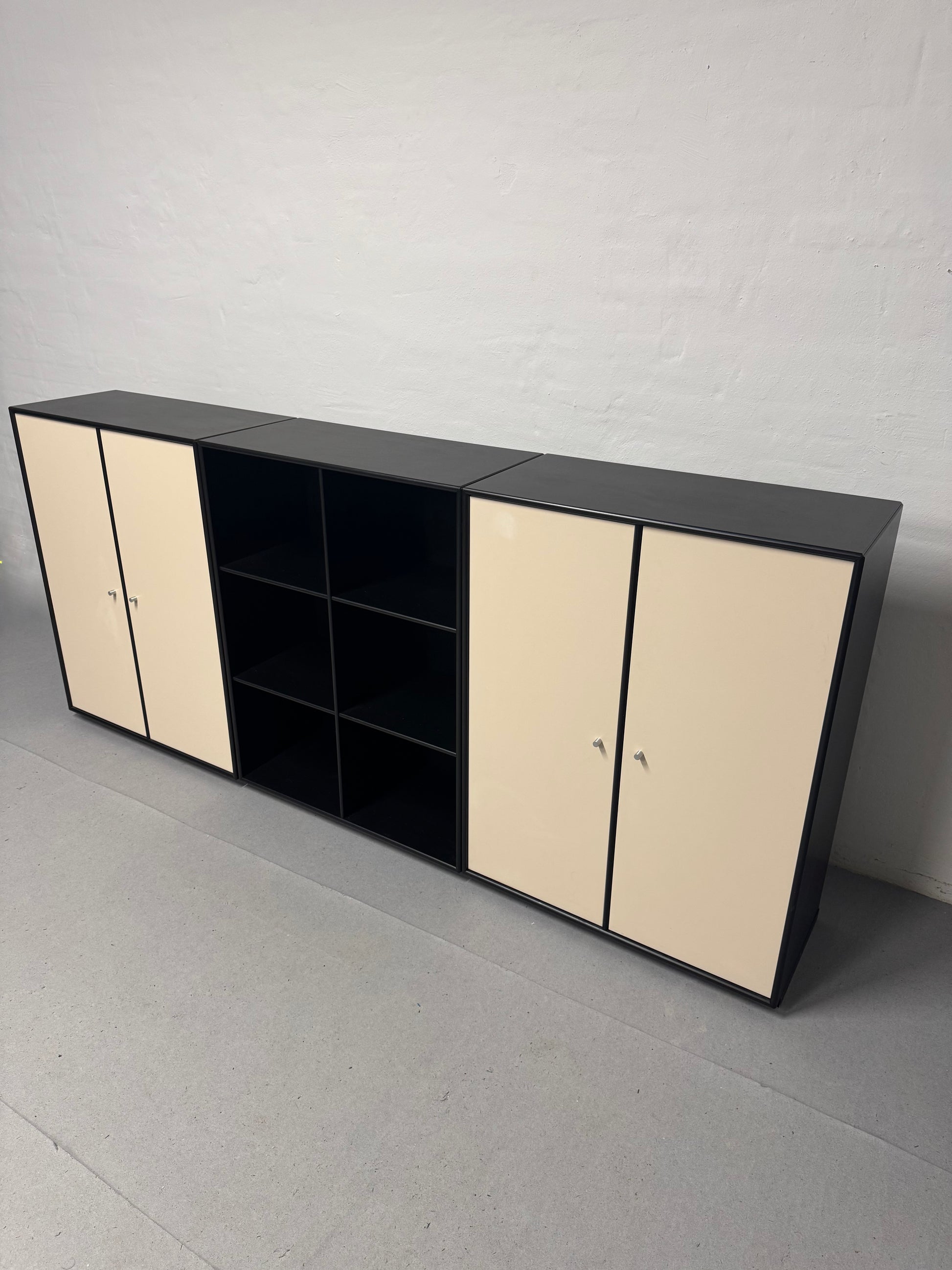 Sorte Montana moduler, super flot og elegant udtryk, med hylder som kan rykkes rundt alt efter behov, samt låger på to af modulerne -der er seks rum i hvert modulet.
