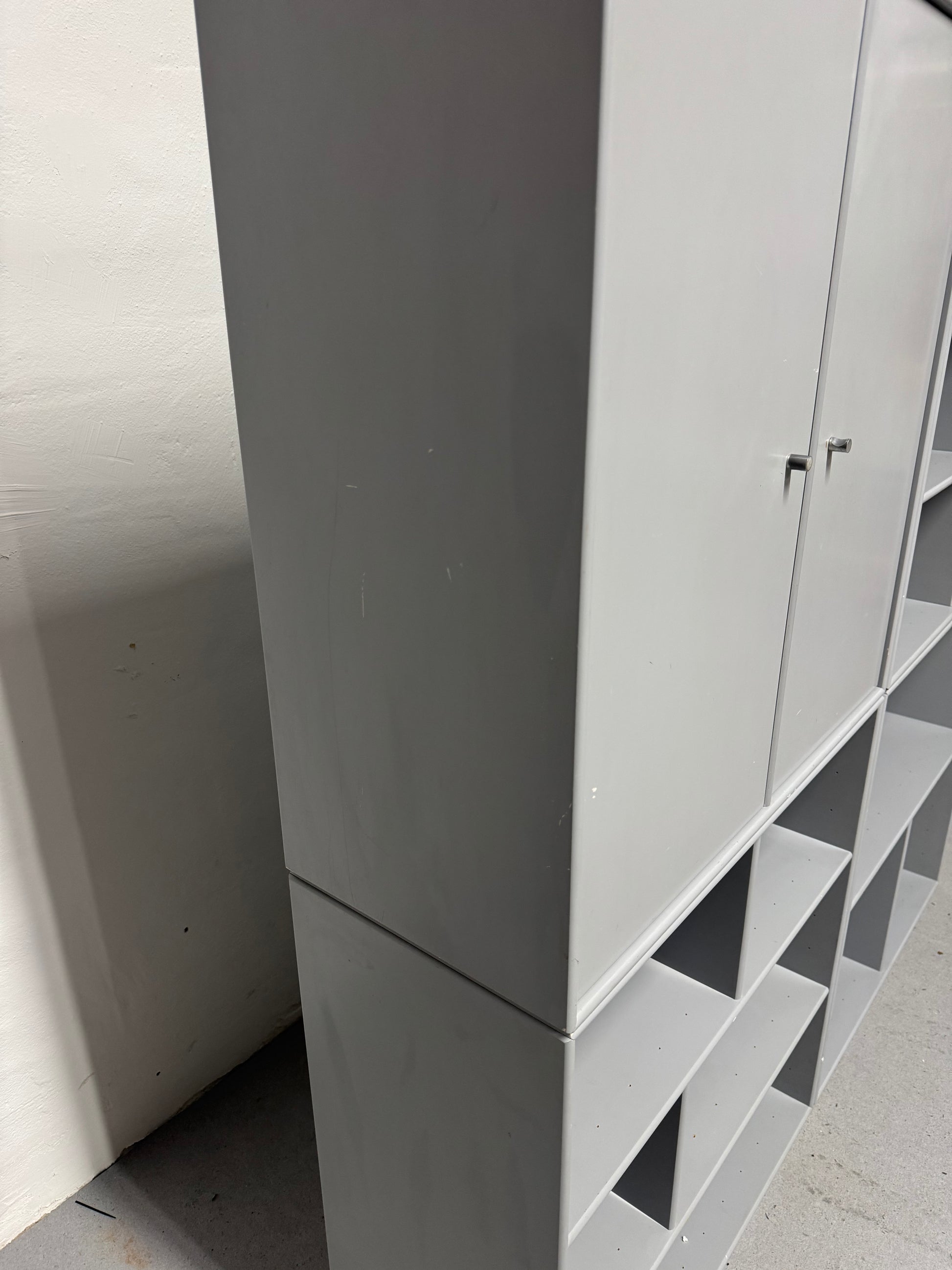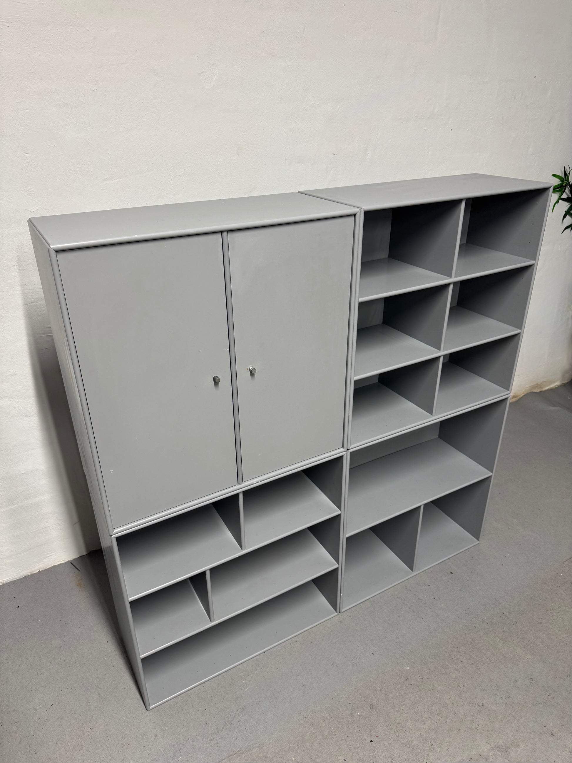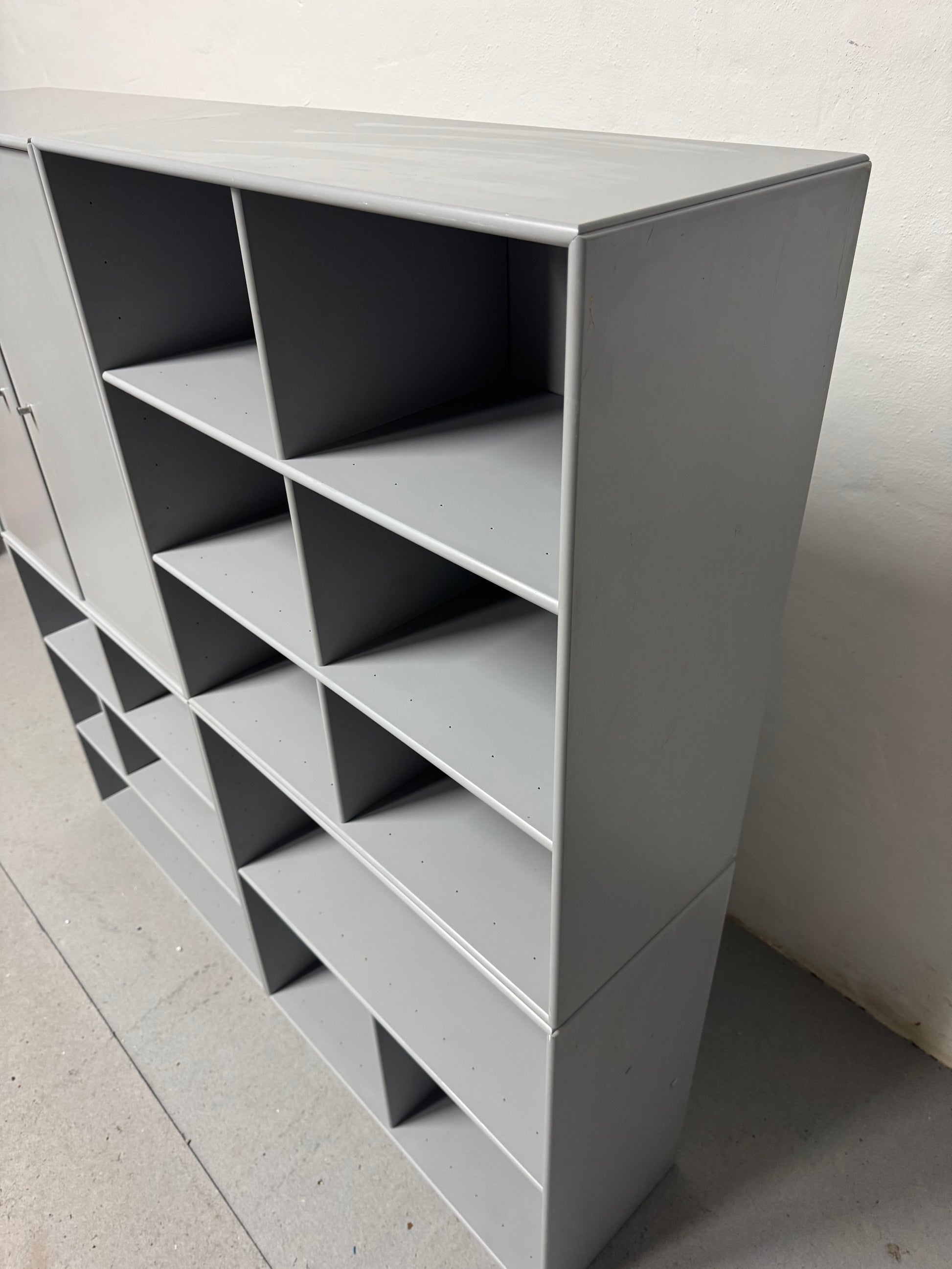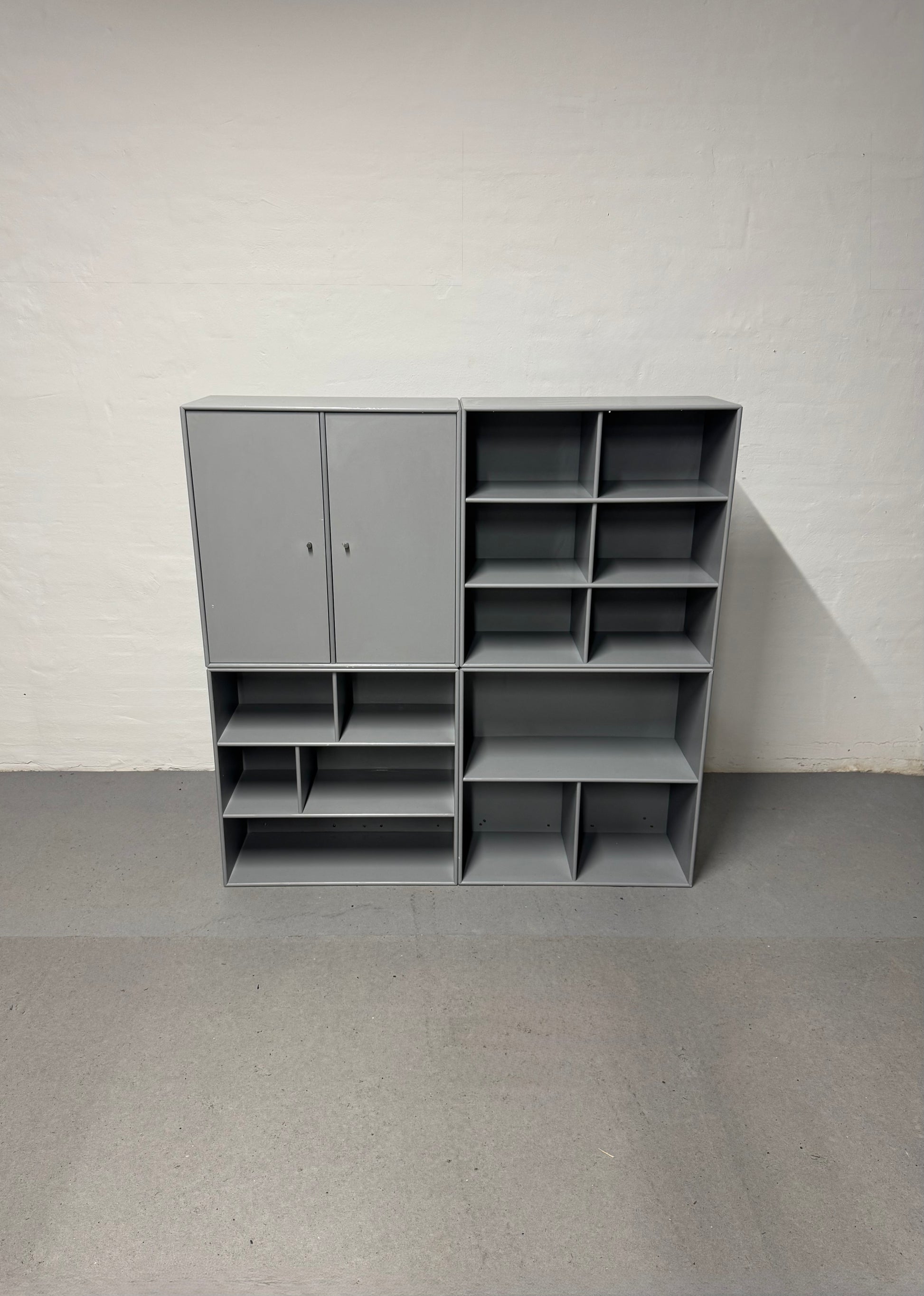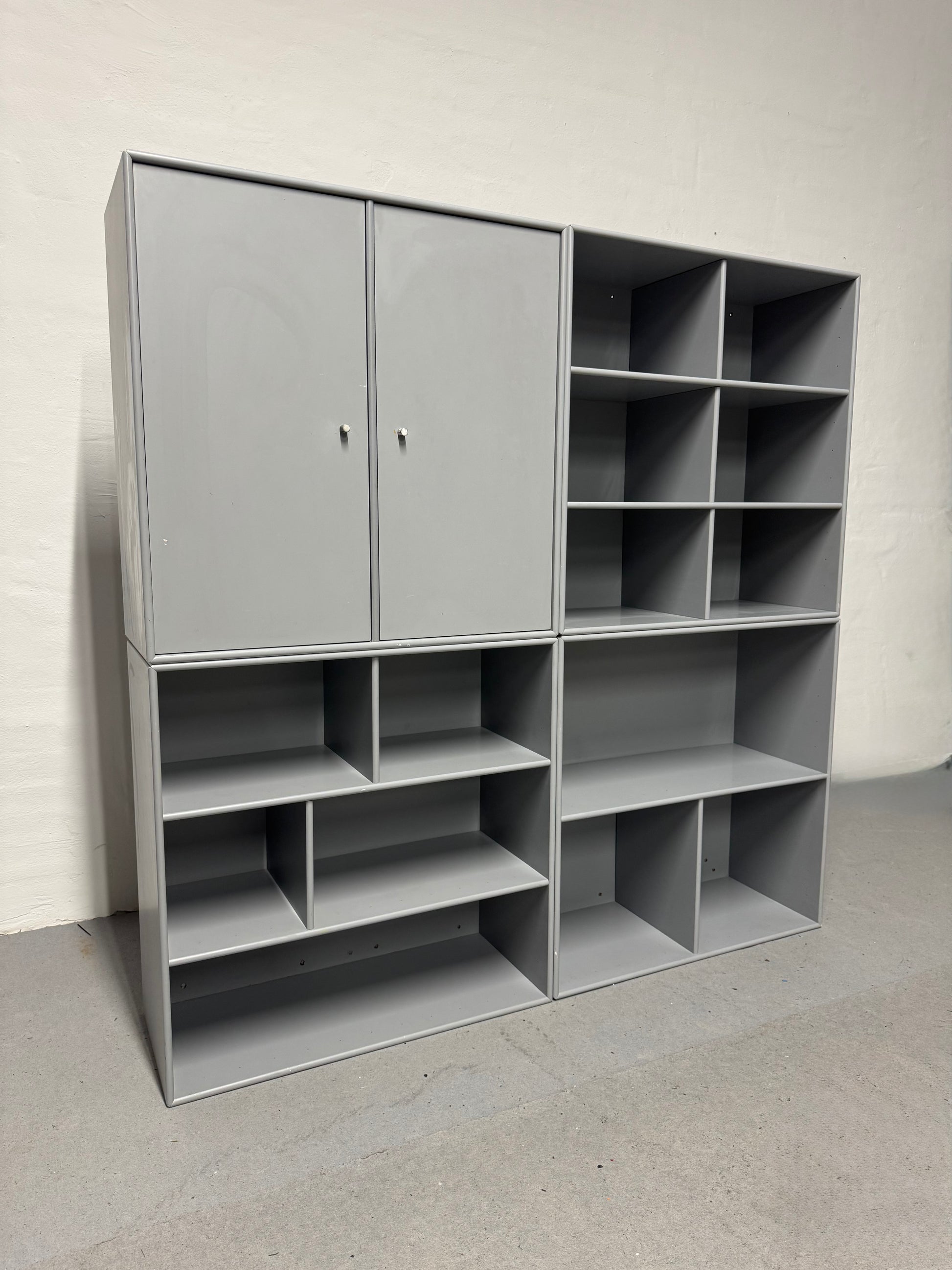 Grå Montana moduler, super flot og elegant udtryk -med hylder som kan rykkes rundt alt efter behov, samt et modul med låger. Ophæng medfølger.