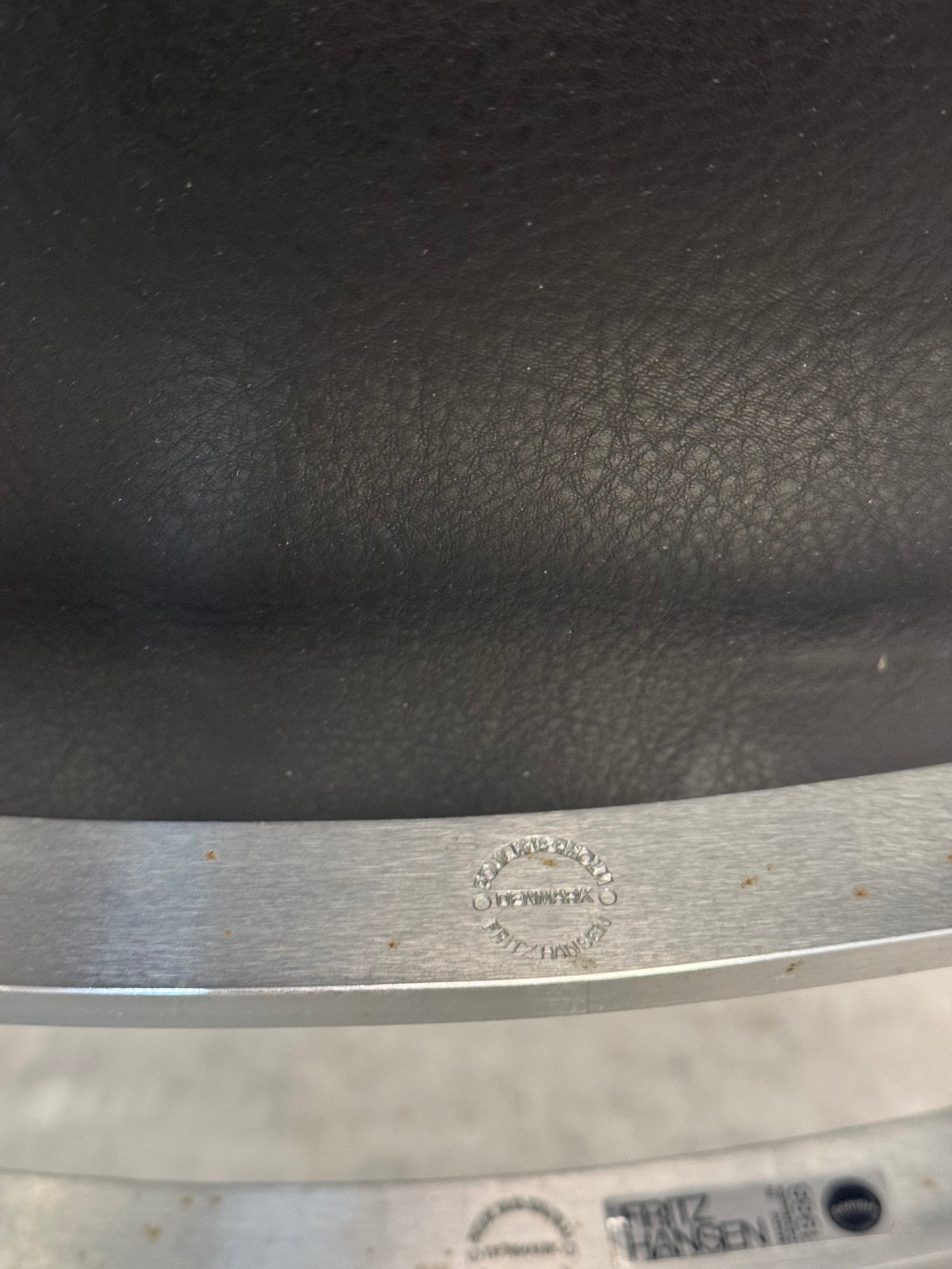 Stolene er i sort læder, designet af Poul Kjærholm, fremstillet samt mærket hos Fritz Hansen.